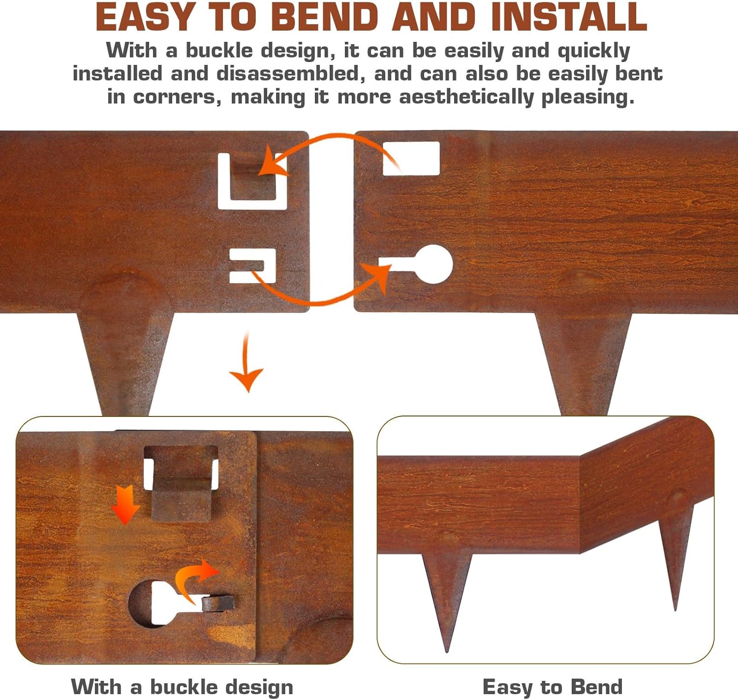 - EASY TO INSTALL - The 42-inch long, 6.3-inch wide steel garden landscape edging is easy to bend and can be easily set to create clear borders that define different areas of your landscape. The steel buckle design allows for quick and easy installation and removal, ensuring a tight connection between sections to avoid loosening. It is easy to install and saves time and effort, providing a hassle-free solution for improving your outdoor environment