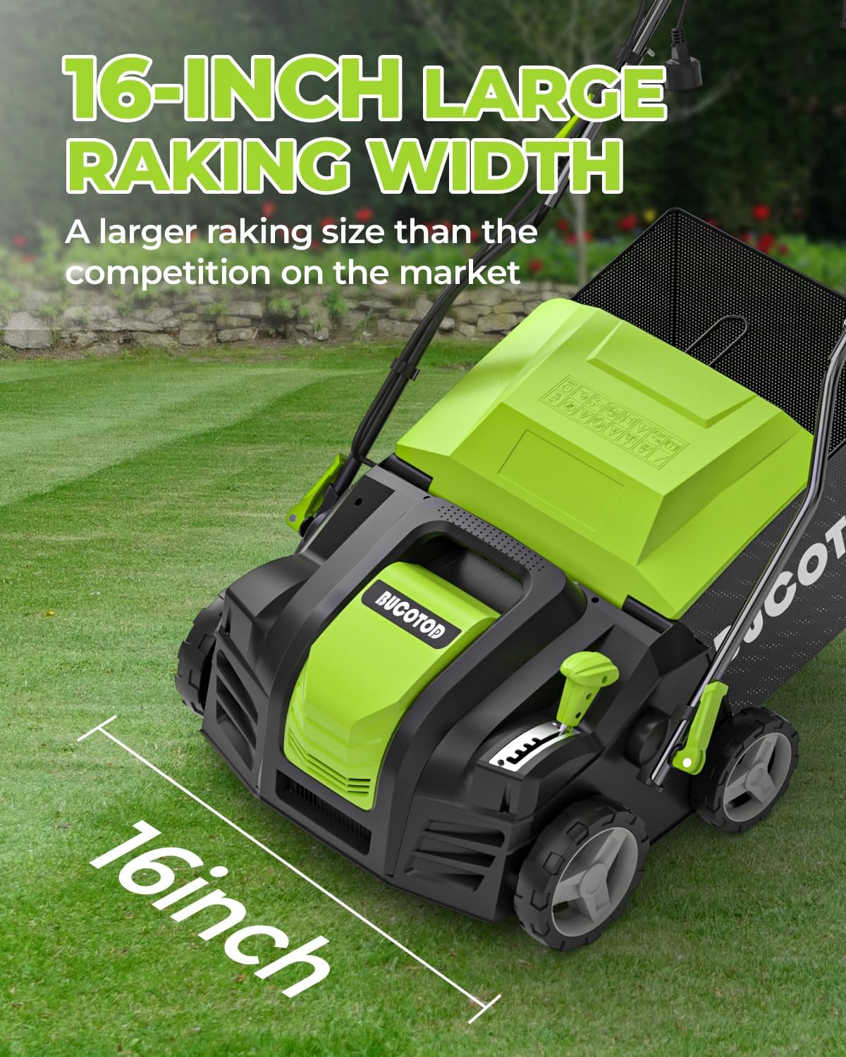 - 15AMP POWERFUL MOTOR: Take your lawn dethatcher care to the next level with an electric lawn dethatcher, featuring a powerful 15-amp motor, no-load speed up to 3500 rpm, and an extra-wide 16-inch rake path for efficient weeding that saves you time.