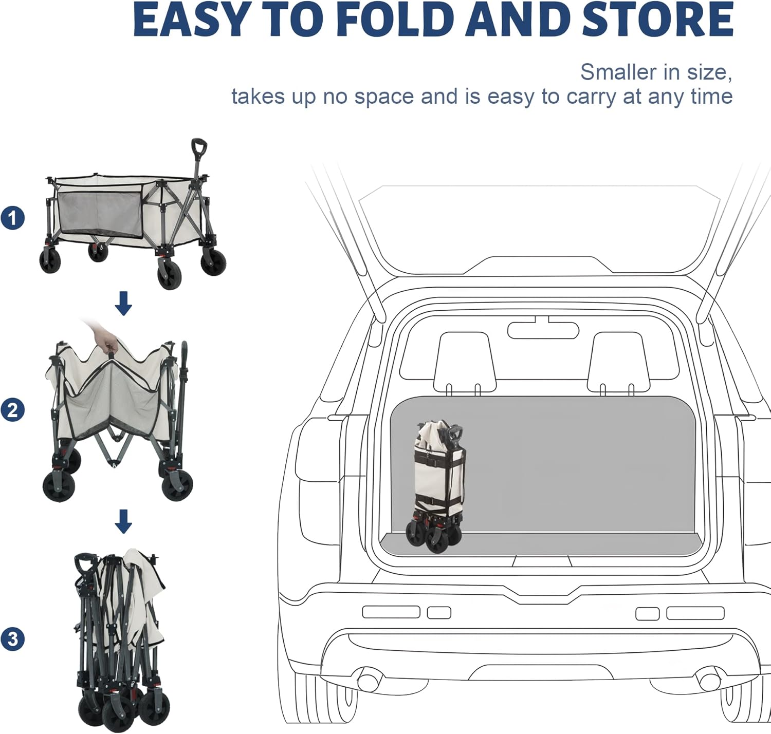 - User-Friendly Design: Easily fold and unfold the beach wagon with just one movement. Compact foldability ensures easy storage in your car trunk or closet for easy storage and transportation. Whether you're heading to the beach, the park, or the grocery store, our utility wagon are your go-to companion for hassle-free travel. (Unfolded size: L 34"x W 19"x H 24"; folded size: L 30"x W 10"x H 7")