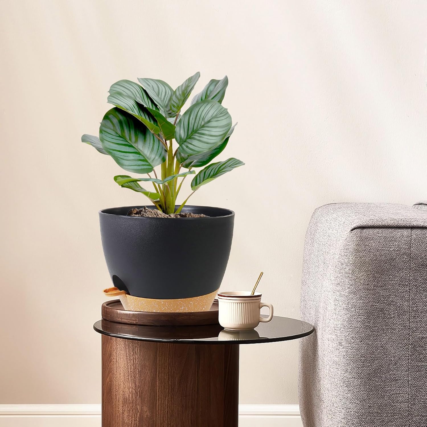 10 inch Self Watering Pots, 2 Pack Plastic Planters with Mesh Drainage Holes for Garden Plants and Flower, Plants Pots with Deep Reservoir for Indoor Outdoor Plants, Black with Brown