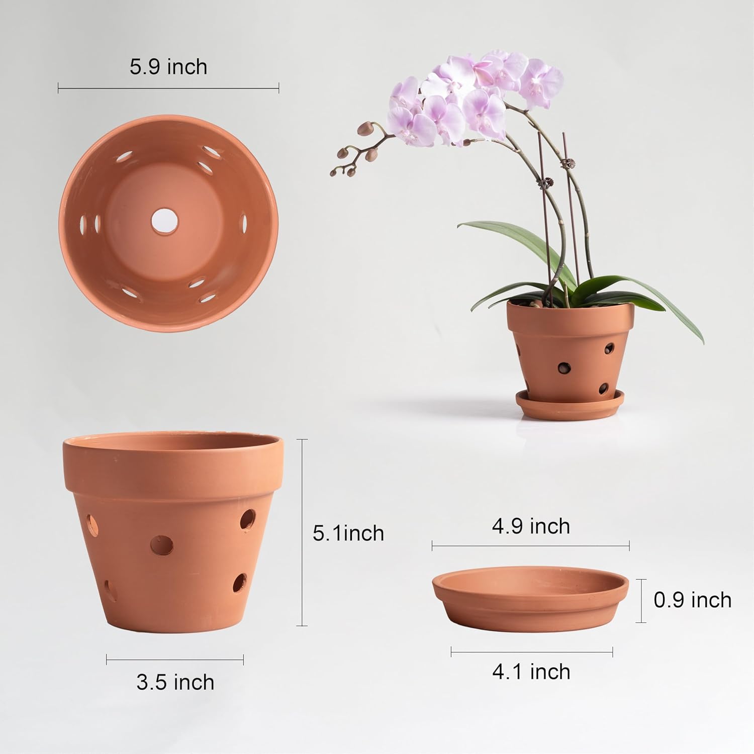 Clay Orchid Pots with Holes,Terracotta Orchid Pots with Drainage Holes & Saucer for Repotting 6 Inch, Orchid Planters for Indoor Plants
