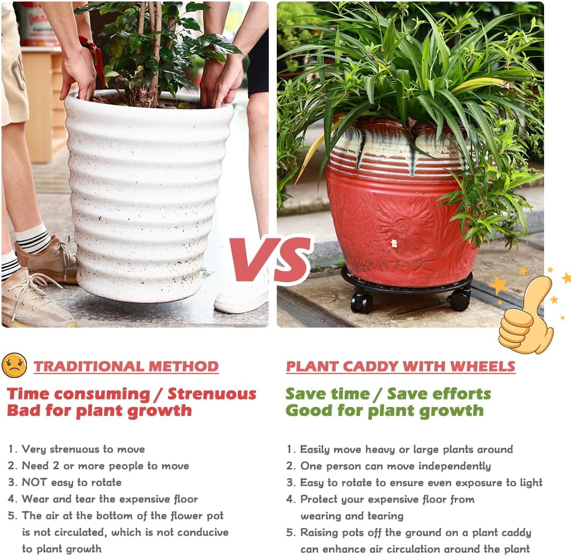 - An Easier Life: Plant caddy with wheels can help you to freely move plants around to best suit the design of your home and your garden. Very convenient move flower pots without lifting them, save time and effort.