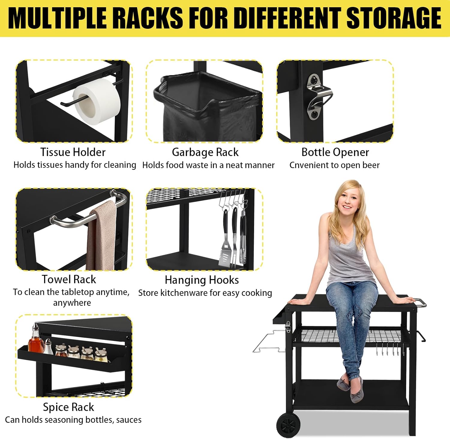 Outvita Outdoor Grill Cart, Movable Food Prep and Work Cart Table, Pizza Oven Stand Table with Wheels, Indoor & Outdoor Multifunctiona BBQ Cart with Mesh Racks for Home Party Camping