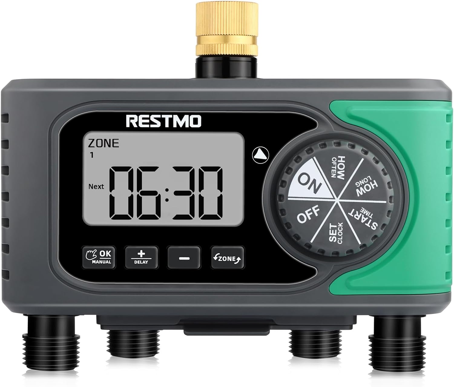 RESTMO 4-Outlet Sprinkler Timer with Brass Inlet, 4 Zone Programmable Water Timer for Garden Hose, Automatic Digital Control | Manual ON/Off | Rain Delay, for Outdoor Faucet, Drip Irrigation and Lawn