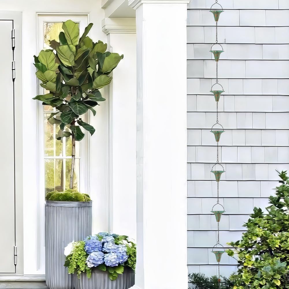 - Replacement Downspout for Gutters: The rain chain adopts a retro green funnel shape design. Rain gutter chains can not only effectively guide the flow of rainwater, but also decorate the eaves and bringing different visual effects. An elegant alternative to traditional gutter downspouts