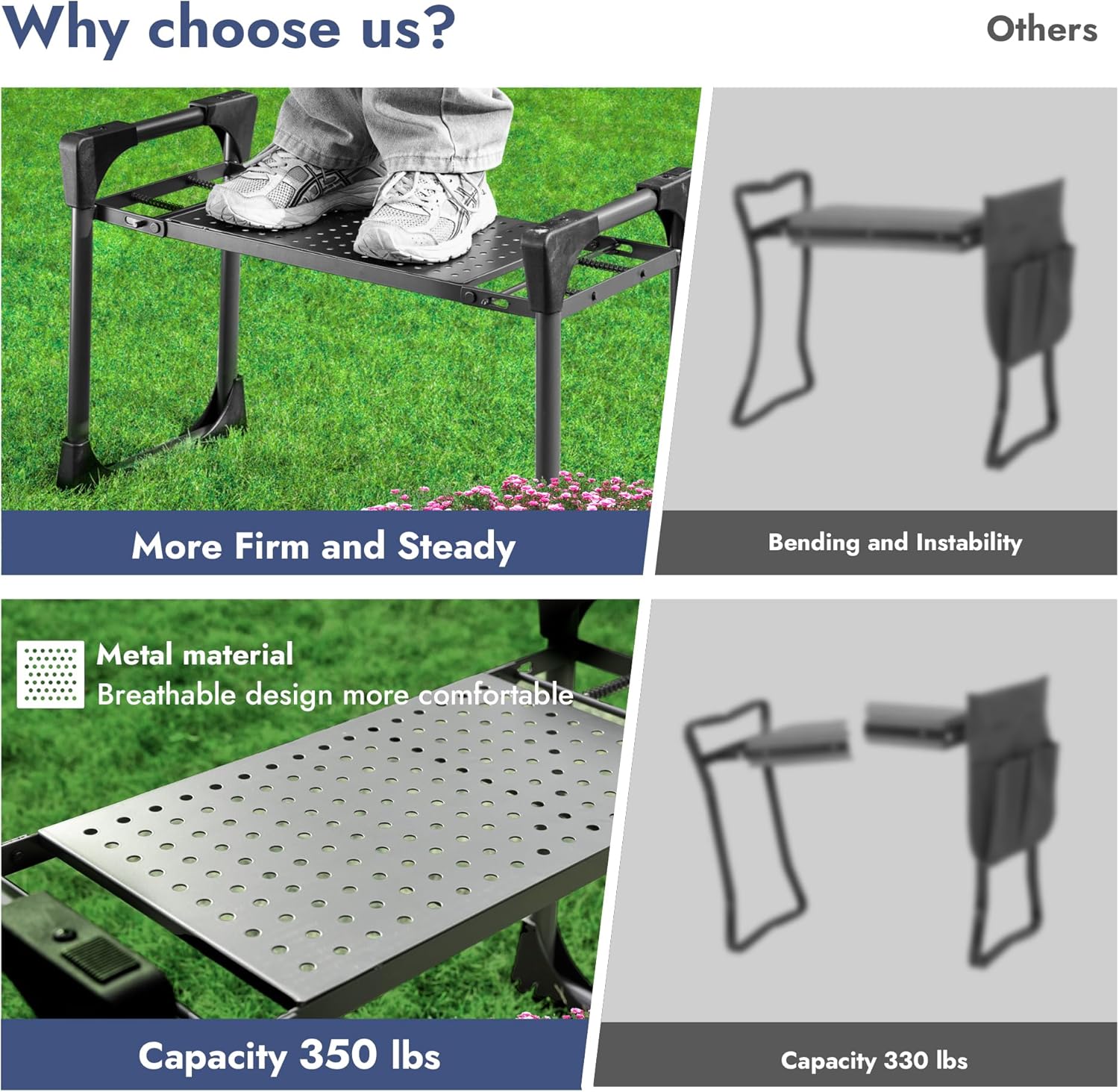 - 【Holds Up To 350 lbs! 】Gardening work seat is made of steel, which is stronger than the older generation. The reinforced design with four additional protective corners is more ergonomic and suitable for long-term gardening work.