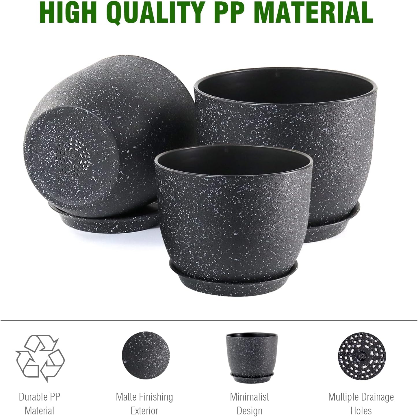 9/8/7.5 inch Plant Pots, Set of 3 Modern Decorative Plastic Planters with Drainage Holes and Saucer for Garden House Plants, Flower Pots for Indoor Outdoor Plants, Speckled Black