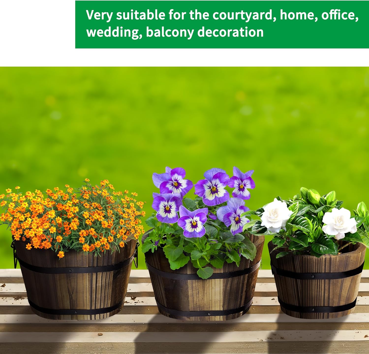 - 【Wide Application】Our wooden barrel planters set is a good choice for indoor and outdoor decor.Nice for home,decor,office, wedding, balcony,patio, garden, bedroom,vacation, other artificial plants and flowers.You can feel the quiet rural comfort when garden or front yard planting.