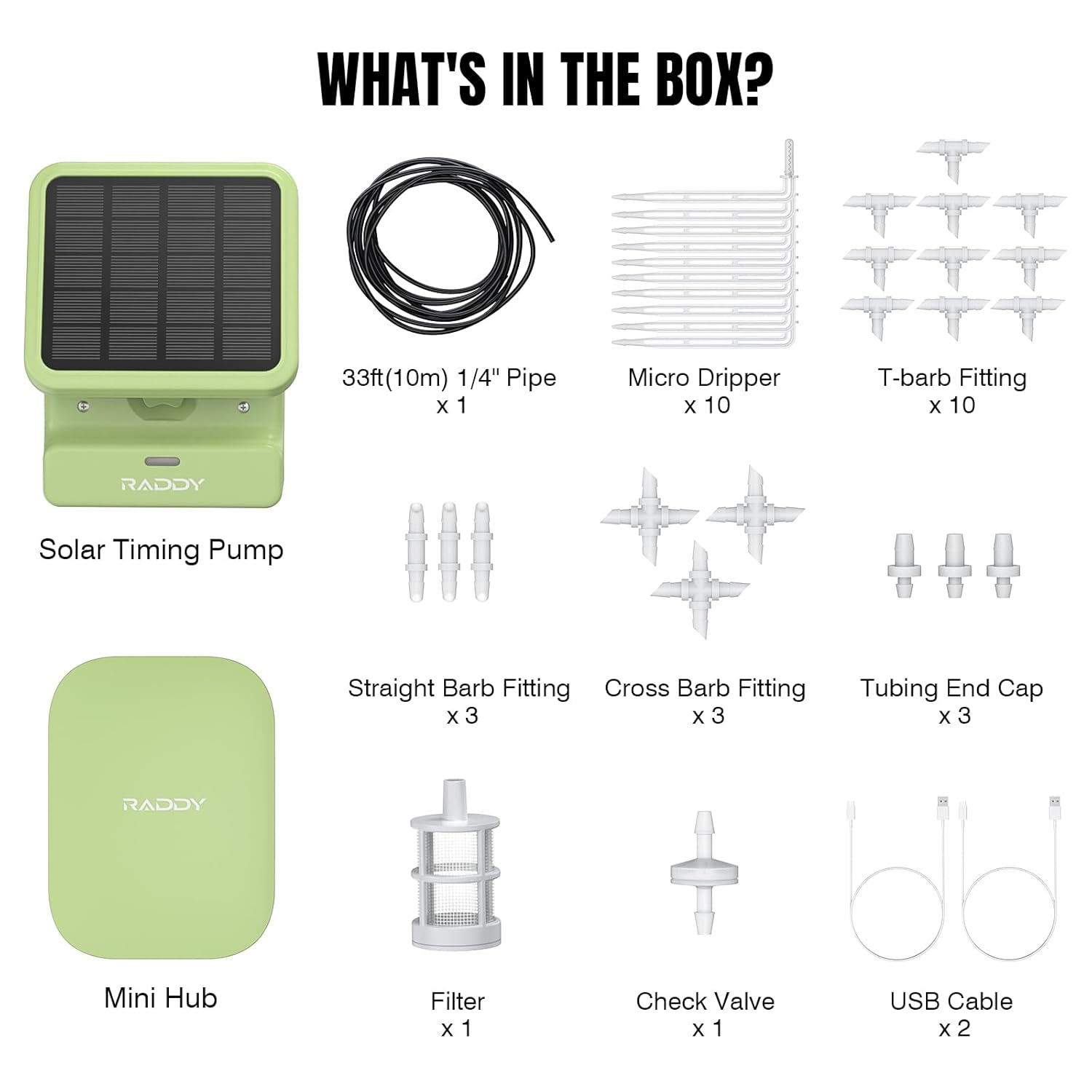 - Easy Installation: The Raddy WS-2 complete kit makes installation a breeze. Package of kits meets the watering of 10 plants, which are WS-2 Auto Irrigation System, 1/4" Tubing (32.8Ft), Filter x 1, Tubing End Caps x 3, Micro Drip Emitters x 10, Straight Barb Fitting x 3, T Barb Fitting x 10, Cross Barb Fitting x 3, Check Valve x 1, USB x 1, Manual x 1.