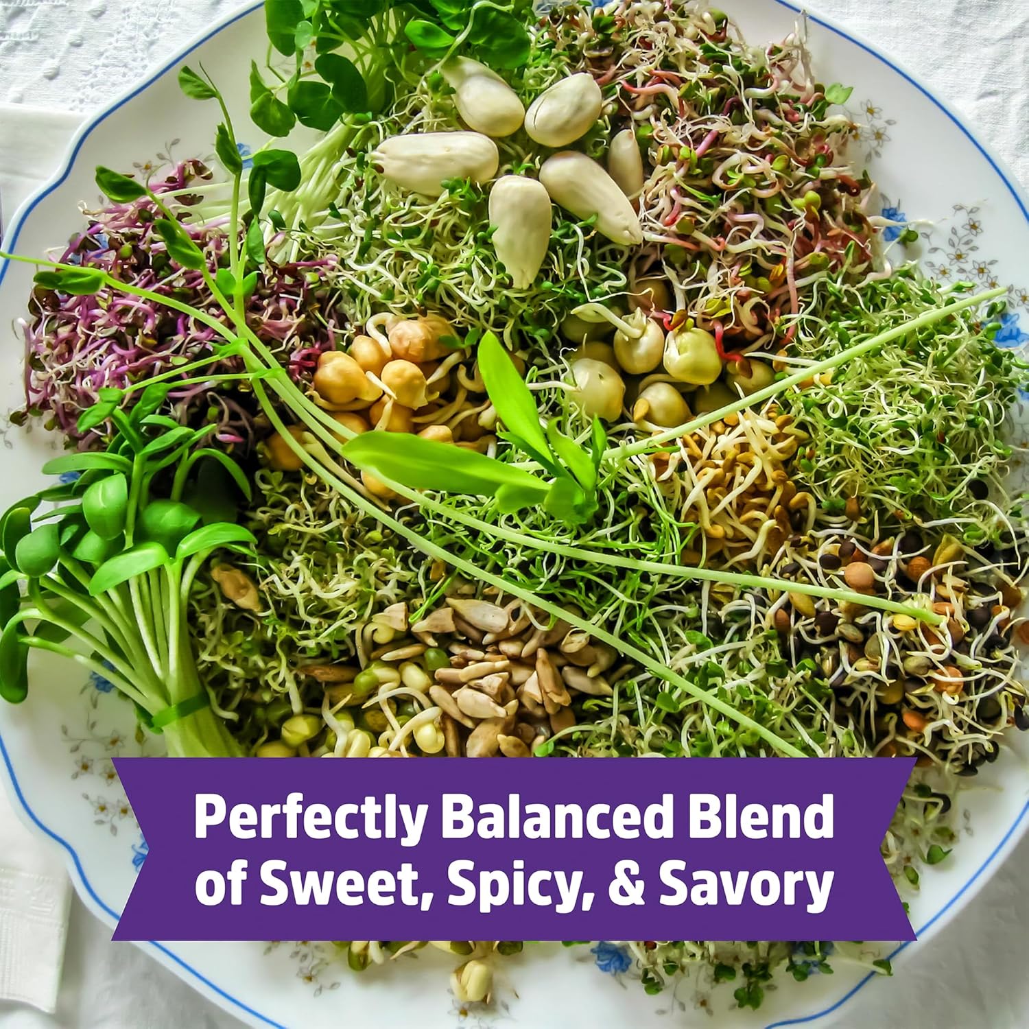 - PERFECT BLEND OF SWEET, SPICY AND SAVOR: Our blend offers a harmonious combination of mild, earthy notes from alfalfa, a subtle peppery kick from radish, mung introduces sweetness, and a hint of freshness from broccoli, creating a delightful medley that enhances the taste of your dishes with a satisfying crunch.