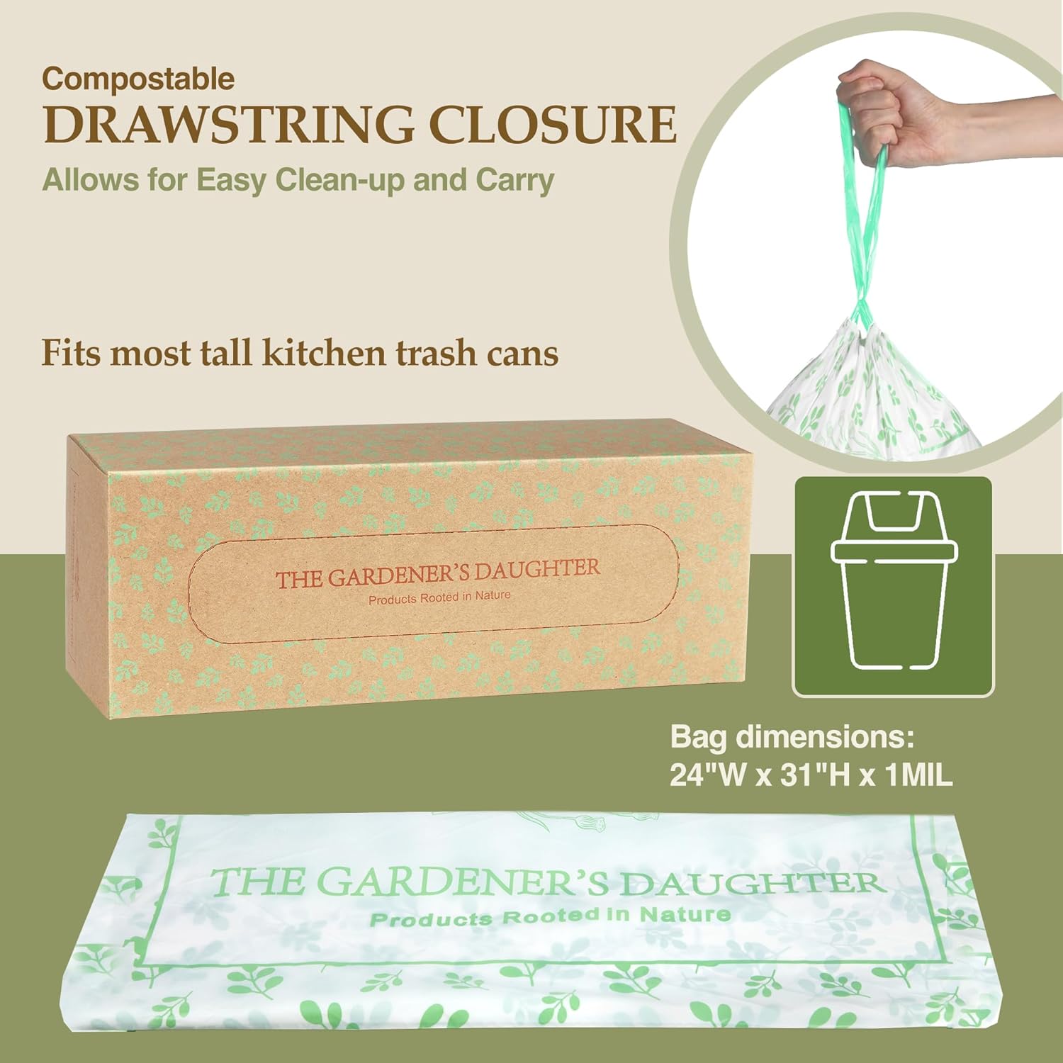 13 Gallon Compostable Trash Bags – Extra Strong, Drawstring Kitchen Bags (30 Count, White) | Leak-Proof, BPI & TUV Certified, Home Compostable – Evergreen by The Gardener's Daughter