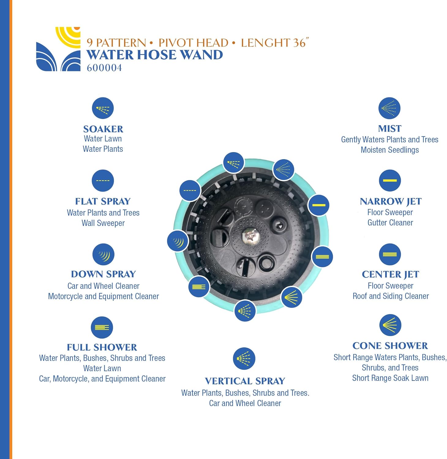 36 Inch Water Hose Wand Featuring 9 Spray Patterns and 180° Pivot Head 600004 with Comfort Grip and Lever Control by New England Garden Tools for Cleaning, Watering Plants & Yards, Washing Cars & Pets