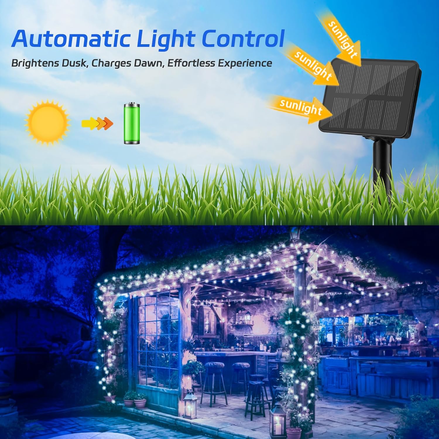 - ✨Solar Powered Efficiency: cshare solar string lights Utilizes solar power for charging, promoting energy conservation, automatic charging, and lighting without the need for additional power sources.