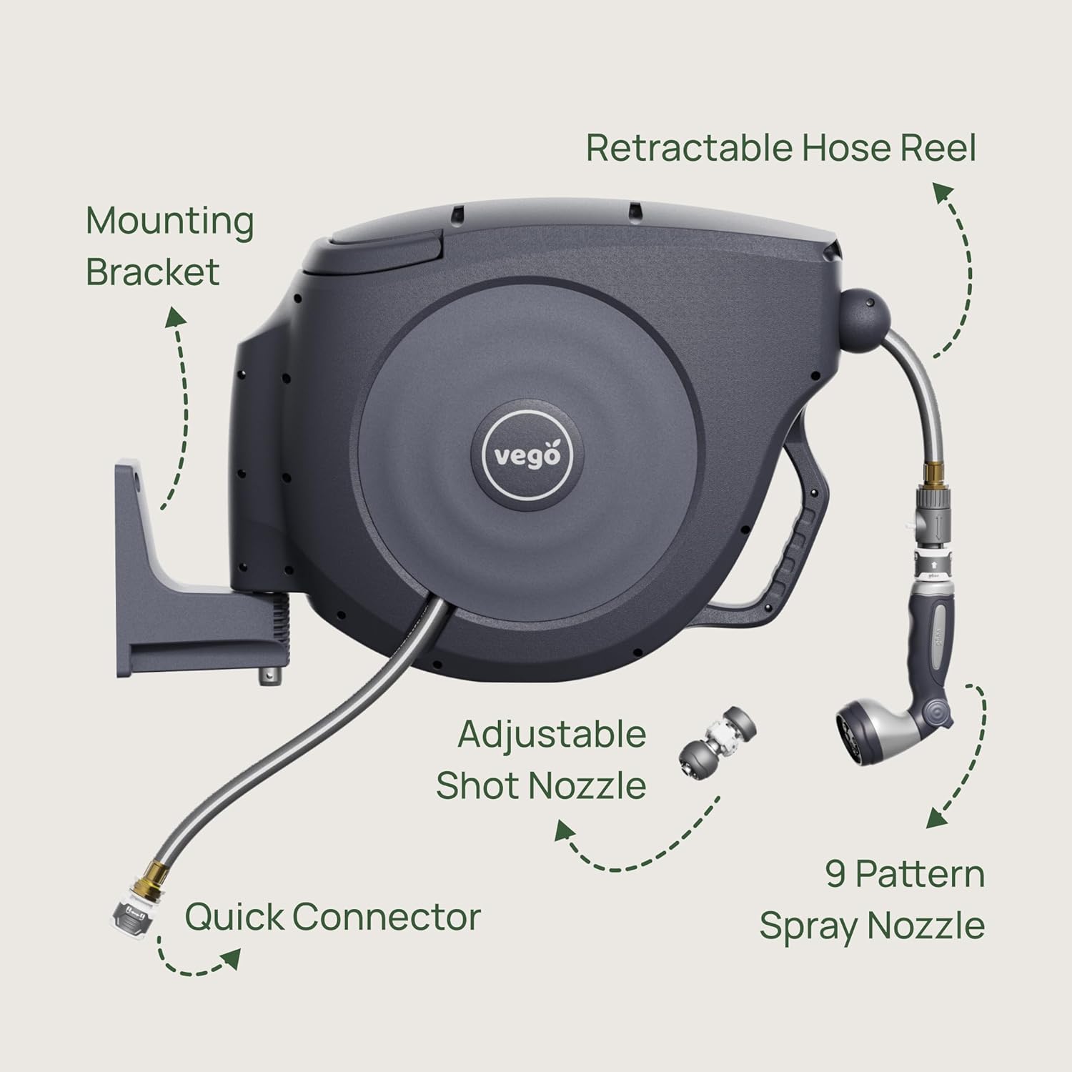 - Eco-friendly and Durable Construction: The Vego Retractable Hose Reel is crafted from eco-friendly and non-toxic materials, ensuring safety for both the environment and human health. Constructed with premium grade plastic and sturdy metals like copper, aluminum alloy, iron, and stainless steel, it's designed for long-lasting durability.