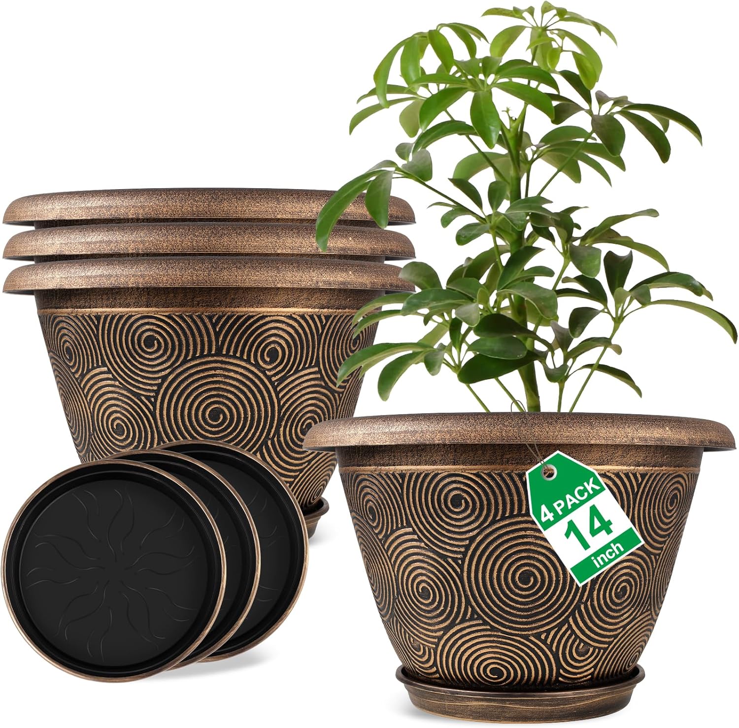 - 【Rolled Rim】Plastic flower pot for indoor plants are designed in rolled rim which helps you to easily move the container, even when it is full of soil. It won't break or crack when lifting. Top diameter: 14 inch, bottom diameter: 7.9 inch,height: 9.7 inch. Set of 4 pack 14 inch Solid plastic large planter pots are suitable for house plants, succulents, flowers, and cactus.
