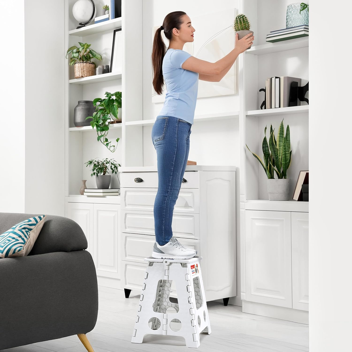 ACSTEP Folding Step Stool 16 Inch Heavy Duty Step Stool Foldable for Adults and Kids, Collapsible Stepping Stool with Handle, Non Slip Folding Stools for Kitchen Hold Up to 400lbs (White 1PC)
