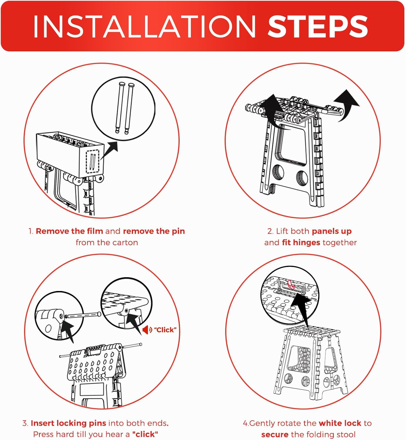 - New Upgrade Construction: The new version of the foldable step stool adopts a new upgrade structure. 1. On the basis of the original pins, the four corners of the bottom increase the plastic reinforcement. 2. The structure at the bottom of the panel adds several plastic steel bars. More load -bearing, not too fragile.