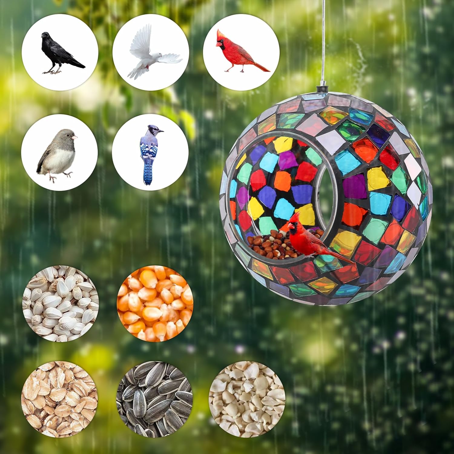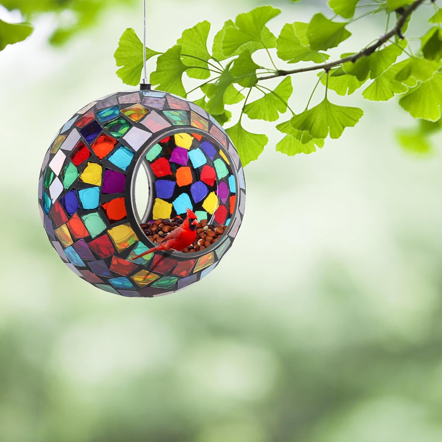 - Hanging Bird Feeder: Mosaic hang bird feeders for outdoors is made of strong mortar and glass. Birds can eat from the rim or hop inside during bad weather