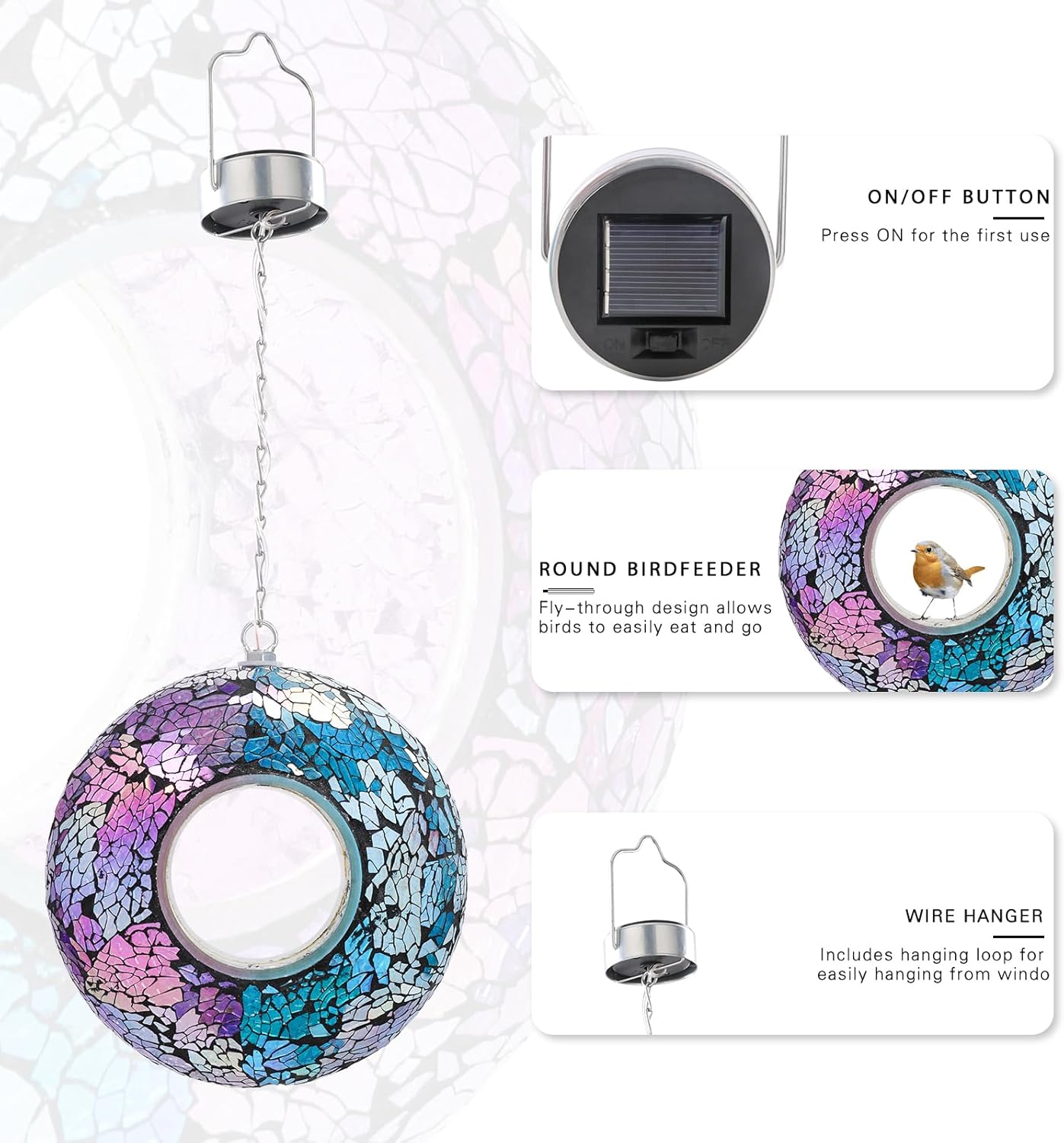 - Stunning Mosaic Artistry: Handcrafted glass mosaic bird feeder create a dazzling 8" orb. Includes sturdy hanging chain to display this functional art piece where sunlight dances across its surface - ideal for gardens, balconies, or porch overhangs