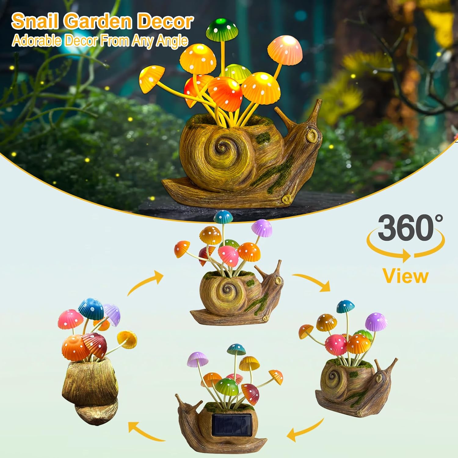 - Adorable Garden Decor Auto ON/OFF -- Solar-Powered garden lights, the upgraded solar panel absorbs sunlight during the day, storing energy to power the mushroom lights at night. As dusk falls, the fairy garden figurines illuminates automatically, casting a colorful and inviting glow