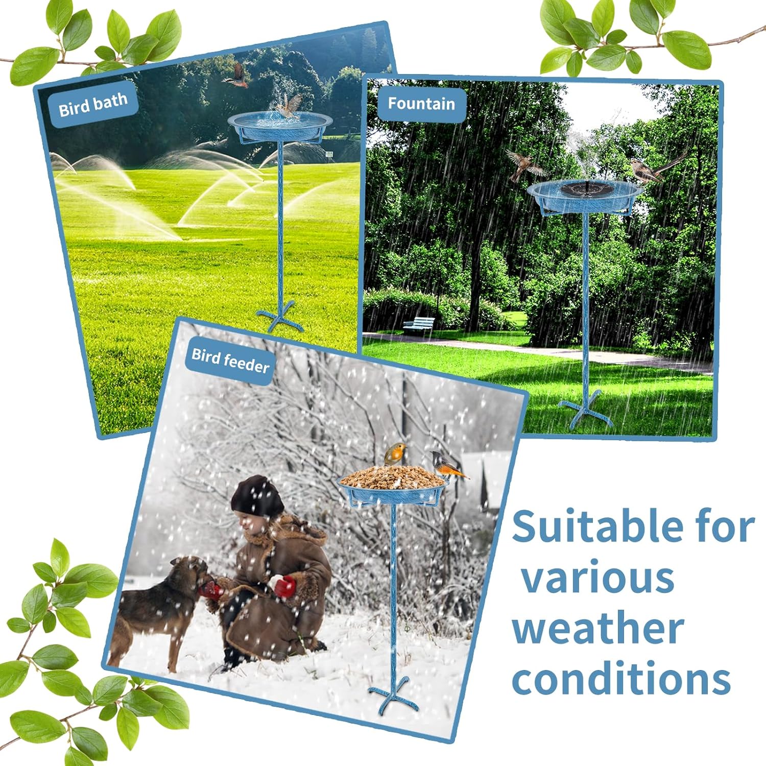- 【Metal Bird Feeder Stand】 The whole bird bath and the pedestal are made of premium quality metal and and covered with safety coating, long-lasting and sturdy, can resist rain, water, and other weather, withstand strong sunlight and cold temperatures.