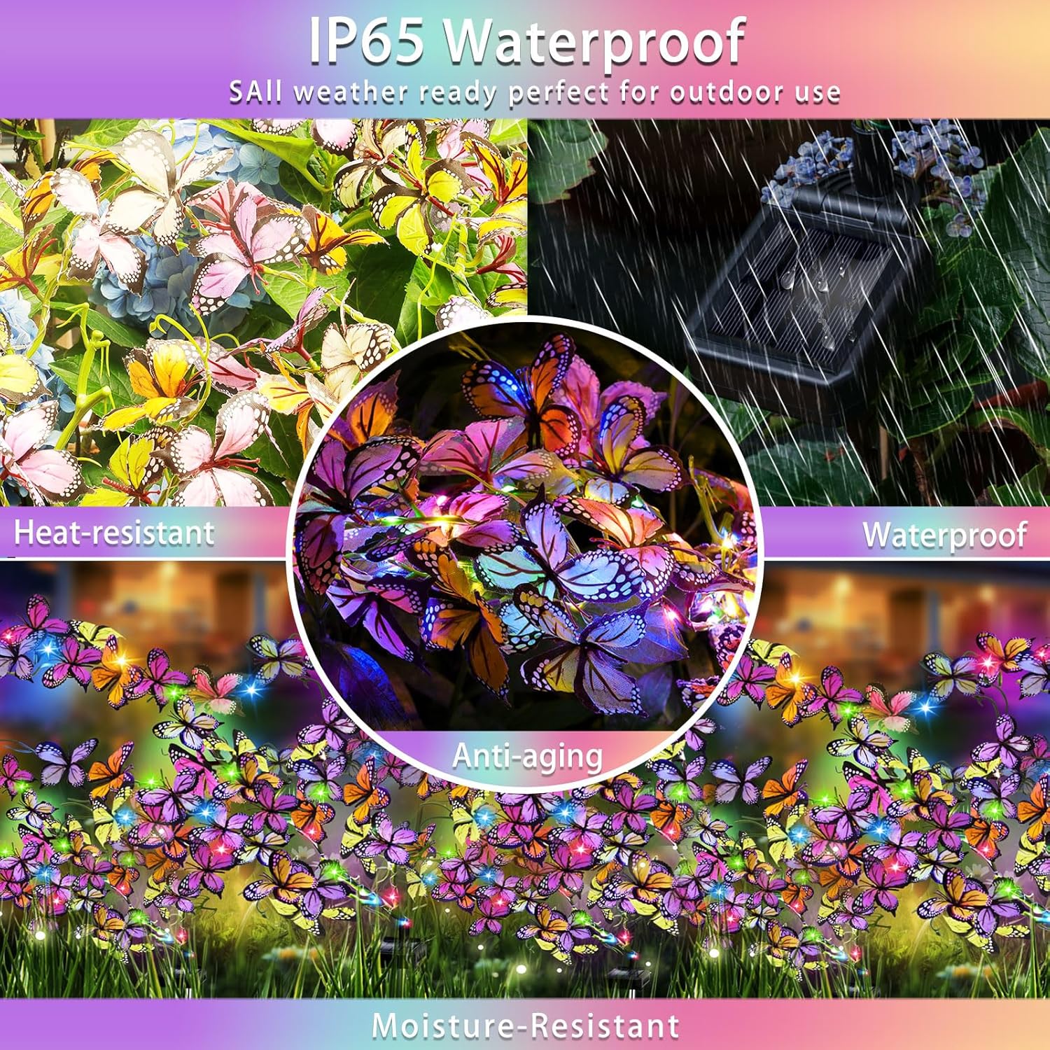 - Unique Solar Butterfly Lights: Our newly designed solar garden lights consists of 33 realistic butterflies and 90 colorful and bright LED lights, the butterflies are reflected in the bright led lights, as if there are colorful butterflies landed in your beautiful garden dancing, adding a perfect picture for your garden, making your neighbors and passersby stop and admire your beautiful garden