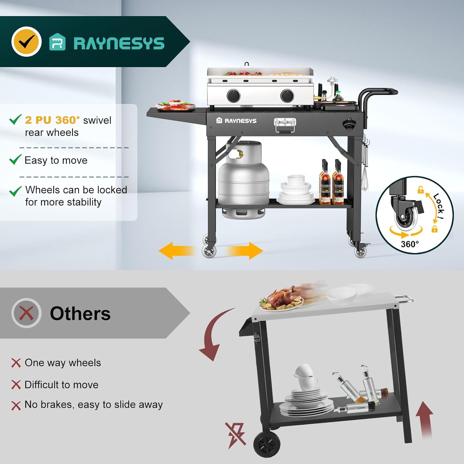 - Multi-Functional Blackstone Table:The grill table is equipped with 3-inch silent universal wheels and curved handle, which can be easily pushed in any direction, convenient to move and save your effort. It can be used as camping table, barbecue table, cooking table, food pre table outdoors. In addition, it can also be used indoors as a mobile workbench and storage rack. The rear wheels with brakes hold the cart securely for more safety.