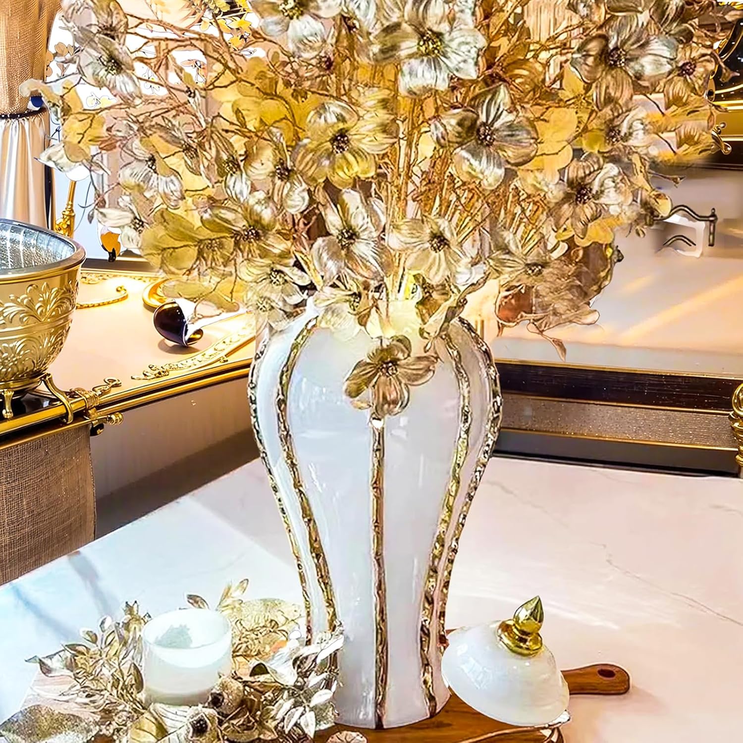 Ginger Jar, White Gold Ceramic Vase Large Handmade Porcelain Vases with Lid, White Gold Decorative Flower Vase for Home, Living Room, Weddings, Centerpieces (14in with Lid)