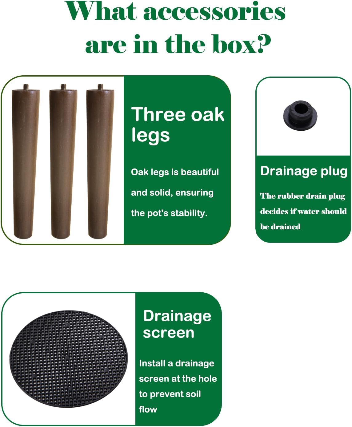 - ✅Includes accessories-one drainage net, one rubber stopper, and three oak legs