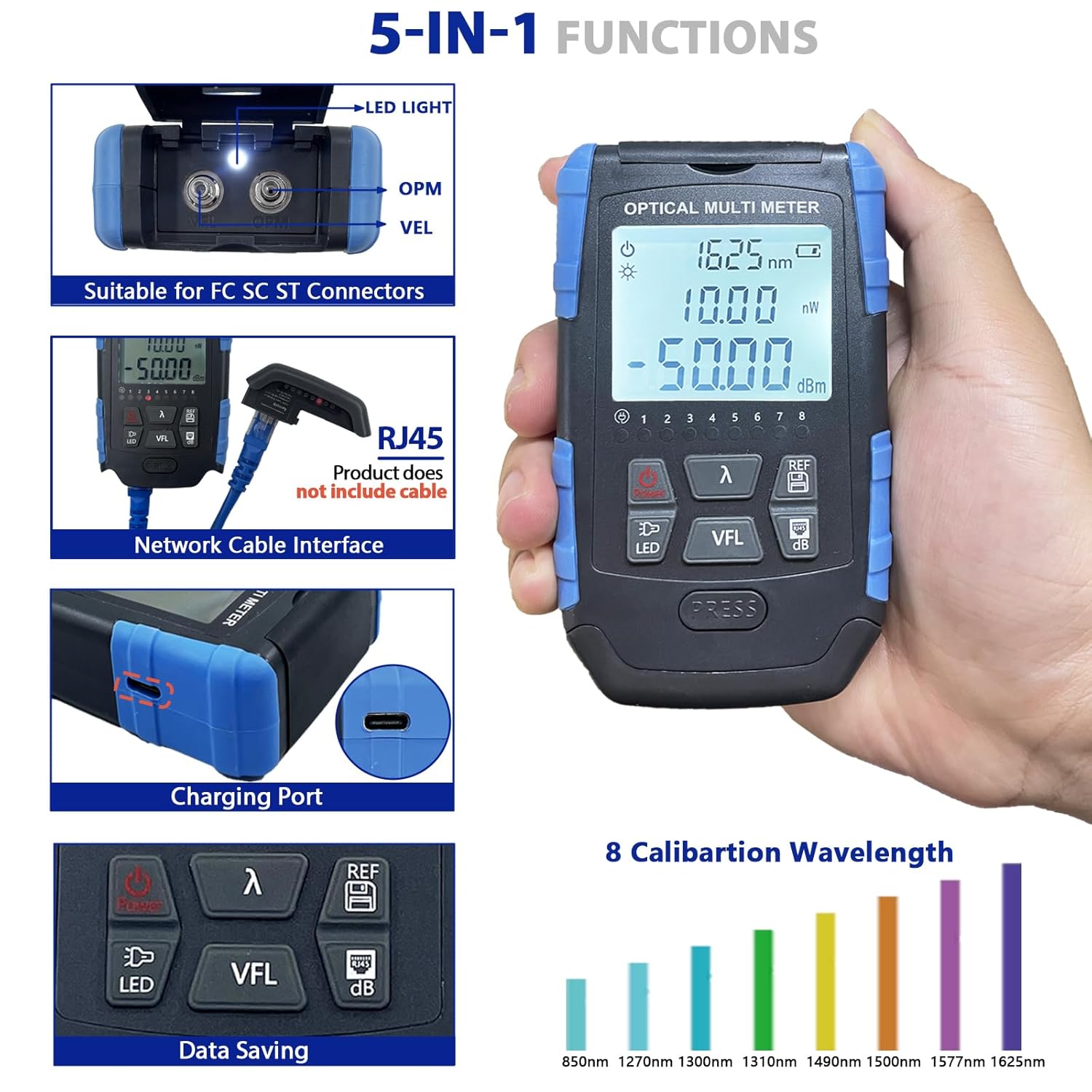 5-in-1 Fiber Optic Cable Tester - Portable Optical Power Meter With Light, FC/SC/ST Universal Interface