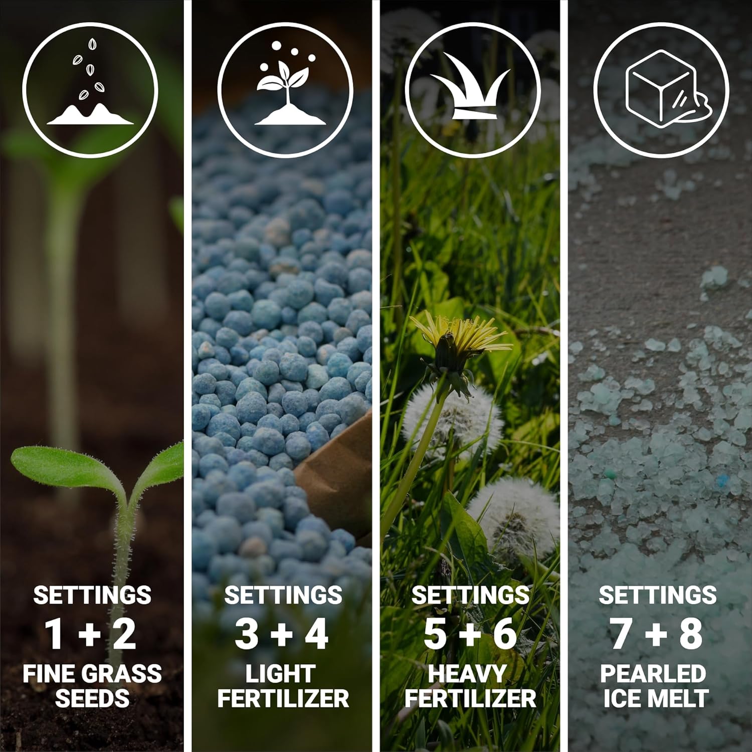 - 8 FLOW-RATE SETTINGS: Easily adjust flow rate with the 8-setting baffle to apply everything from fine granules to larger pellets: Levels 1-2 for fine seeds; 3-4 for light fertilizer; 5-6 for heavy fertilizer; 7-8 for pearled fertilizer and ice-melt