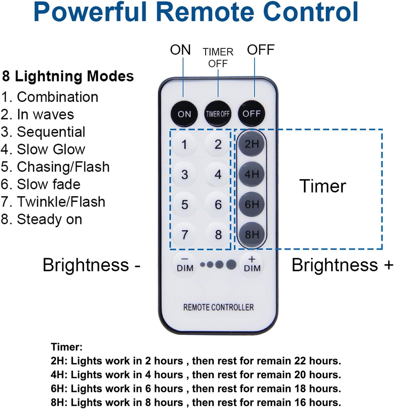 - 8 Lighting Modes: This holiday decorative string light has 8 lighting modes for you to choose- combination, in waves, sequential, slogs, chasing/flash, slow fade, twinkle/flash, and steady on. Fit different occasions and environment, adjust the lighting modes by using remote control or pressing the round button on the black mode controller box