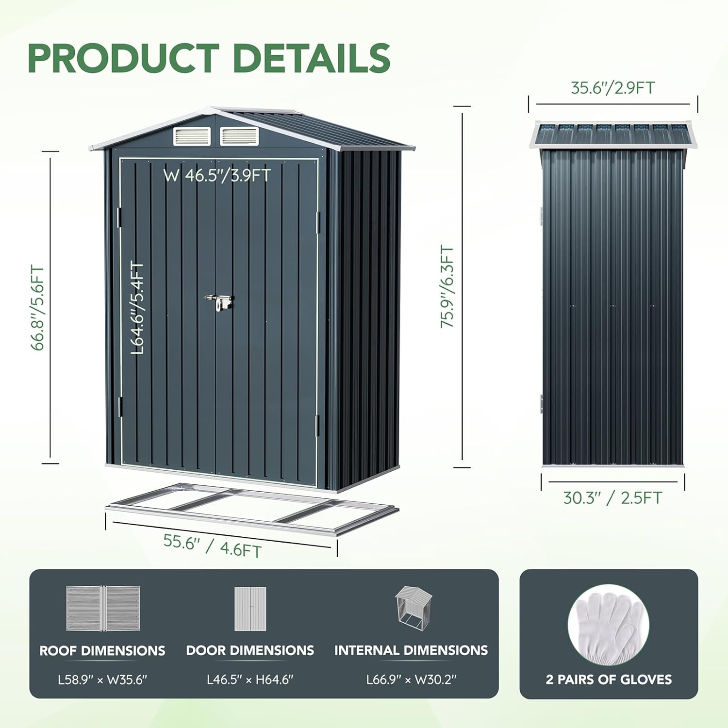 - Compact Size with Maximum Storage: The actual dimensions of our 3x5Ft tool shed are 2.5x 4.6ft (30.3x 55.6 inches), providing ample space for your garden tools and outdoor equipment. While named for convenience, the precise measurements are detailed in the product image for your reference.