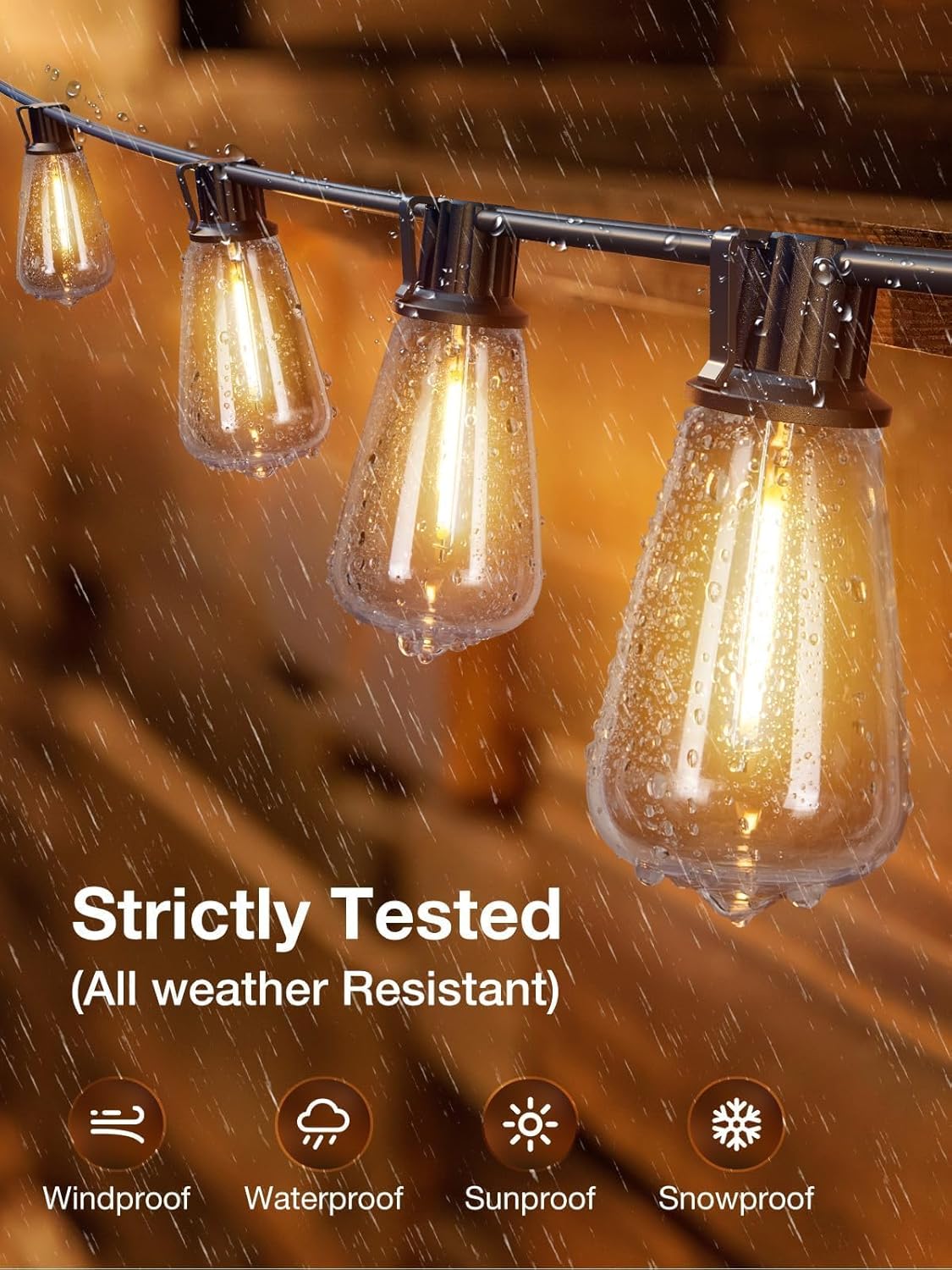 - Weatherproof and Shatterproof: IP65 Waterproof led string lights can withstand cloudy, damp, windy, foggy, rainy, snowy, or extreme temperatures,This making it ideal for year-round use in outdoor spaces like patios, gardens, and bistros, creating a festive and inviting atmosphere. Besides, these led bulbs made from unbreakable PET material and hard anti-drop plastic shells. This ensures the safety of your family, as there is no risk of broken glass shards while hanging these backyard lights