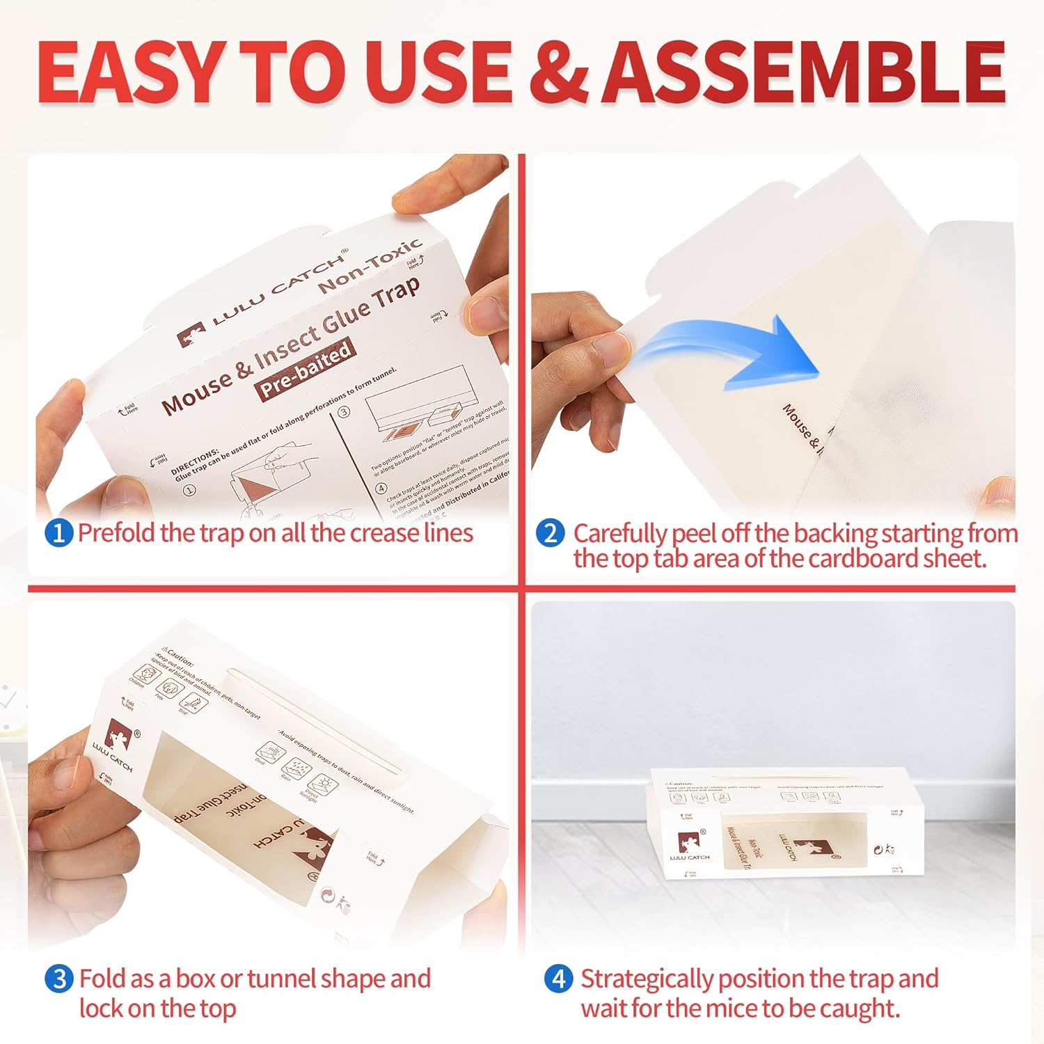 - EASY TO ASSEMBLE STICKY TRAPS: This sticky trap comes with 12 glue boards. Four placement methods can be applied for the best capture: Flat, U-shape, Tunnel Box, and Double Up. No need to clean, re-set, or re-bait the glue traps. We suggest carefully pealing off the backing starting from the top tab area of the cardboard sheet. These glue traps are disposable, just wrap them and throw them straight into the garbage can.