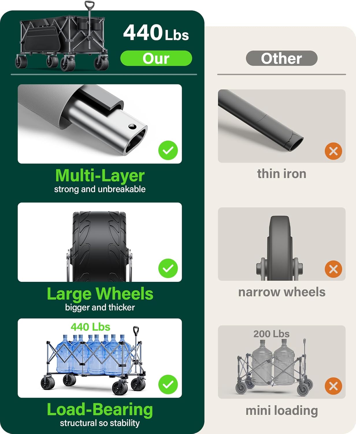 440Lbs Collapsible Wagon Cart with Big Wheels,Utility Wagons with Weight Capacity,Heavy Duty Wagon with Excellent Steering,Ideal for Camping,Gargen,Transport,Outdoor Sports