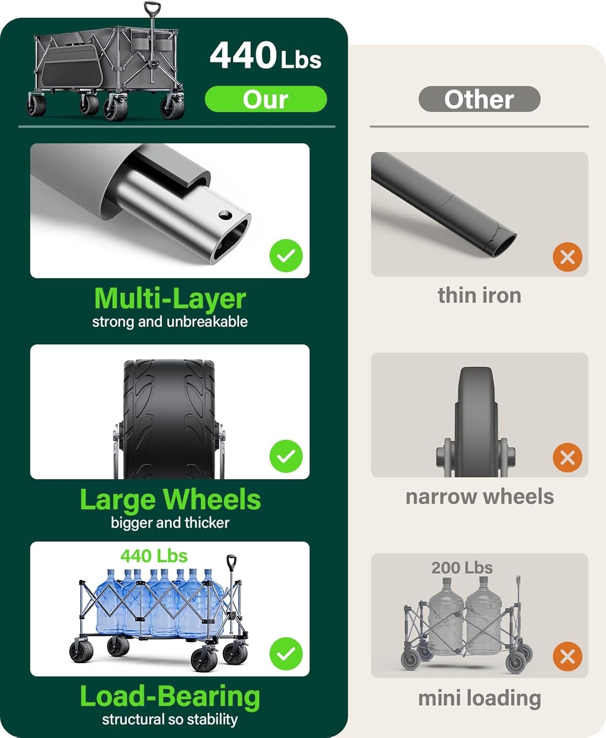 440Lbs Collapsible Wagon Cart with Big Wheels,Utility Wagons with Weight Capacity,Heavy Duty Wagon with Excellent Steering,Ideal for Camping,Gargen,Transport,Outdoor Sports
