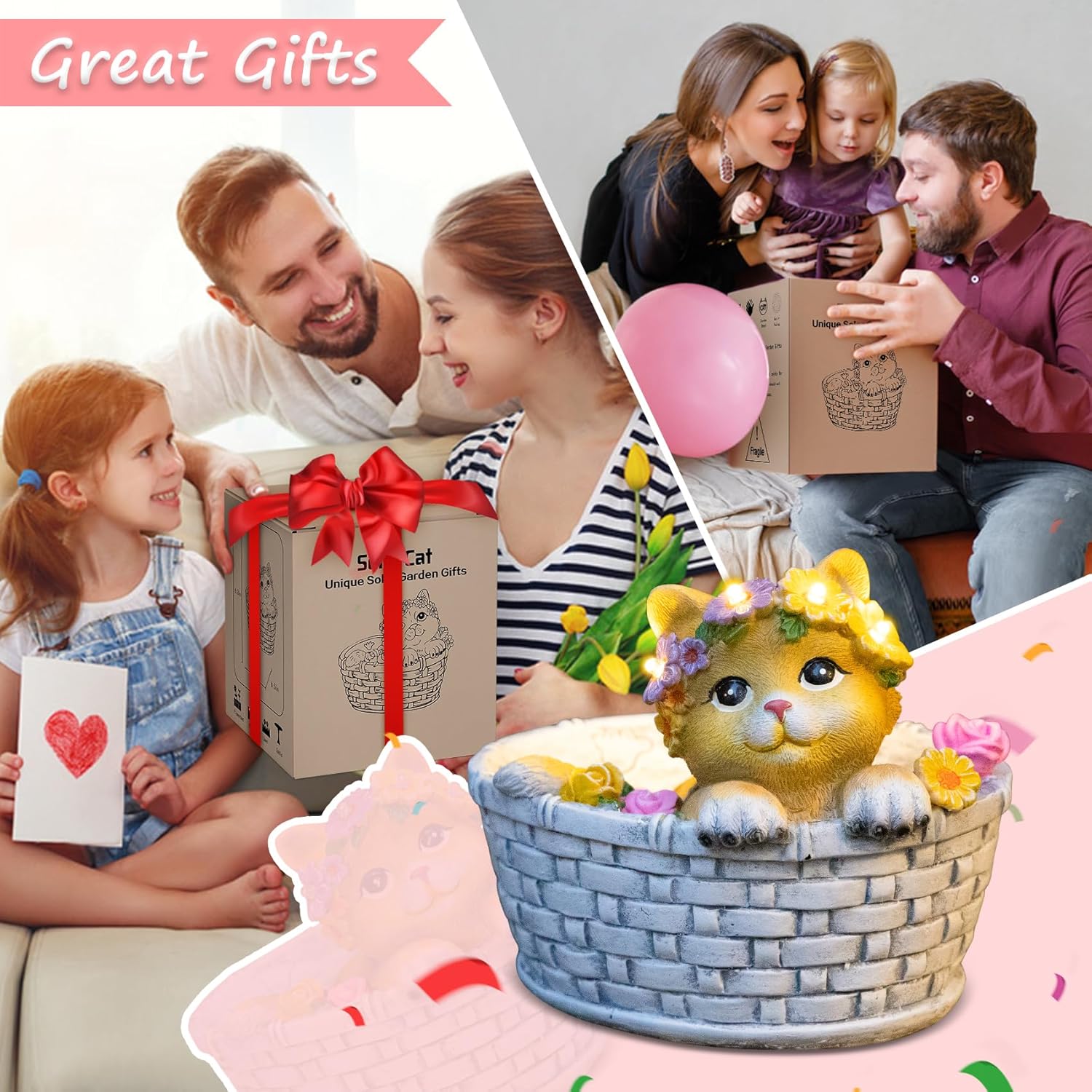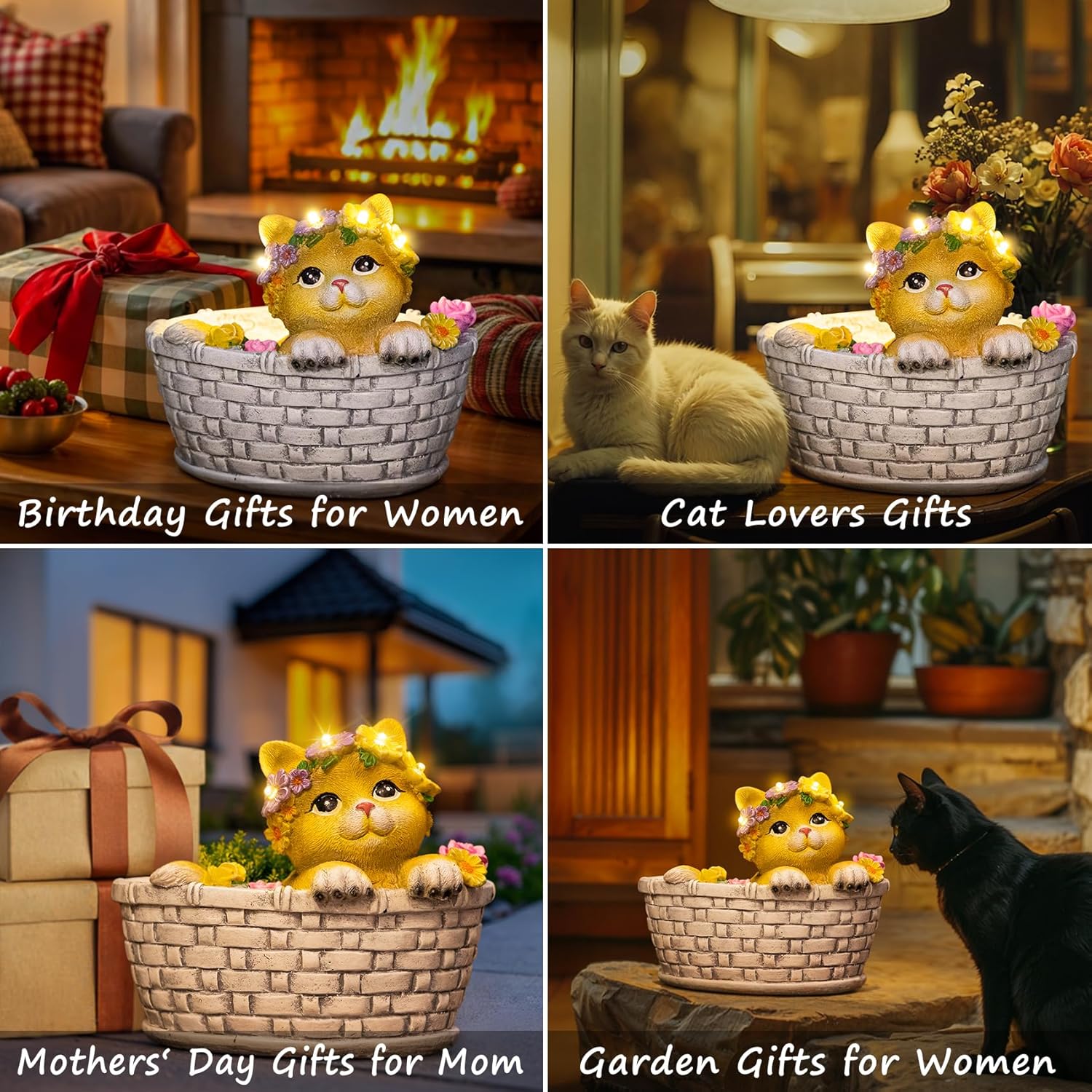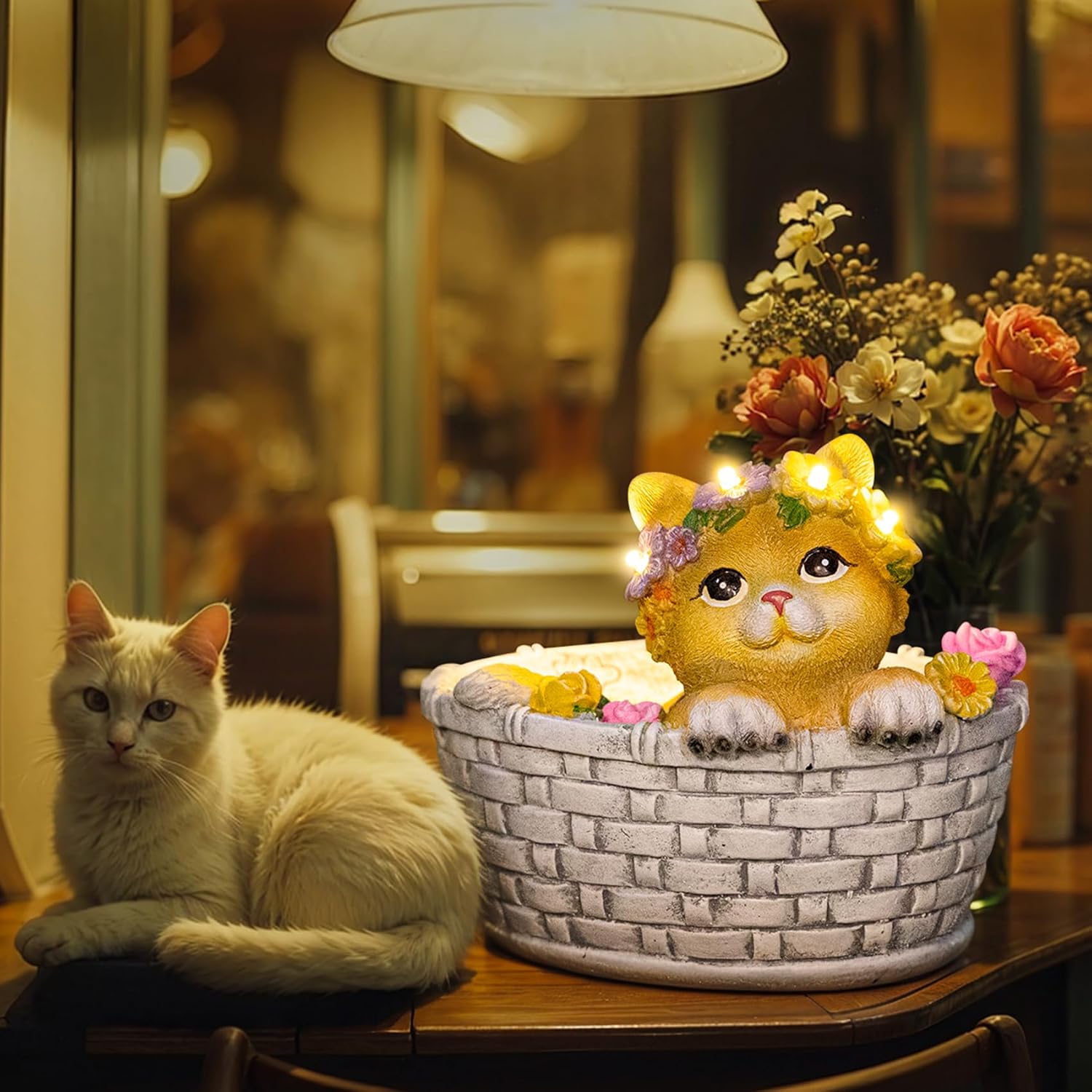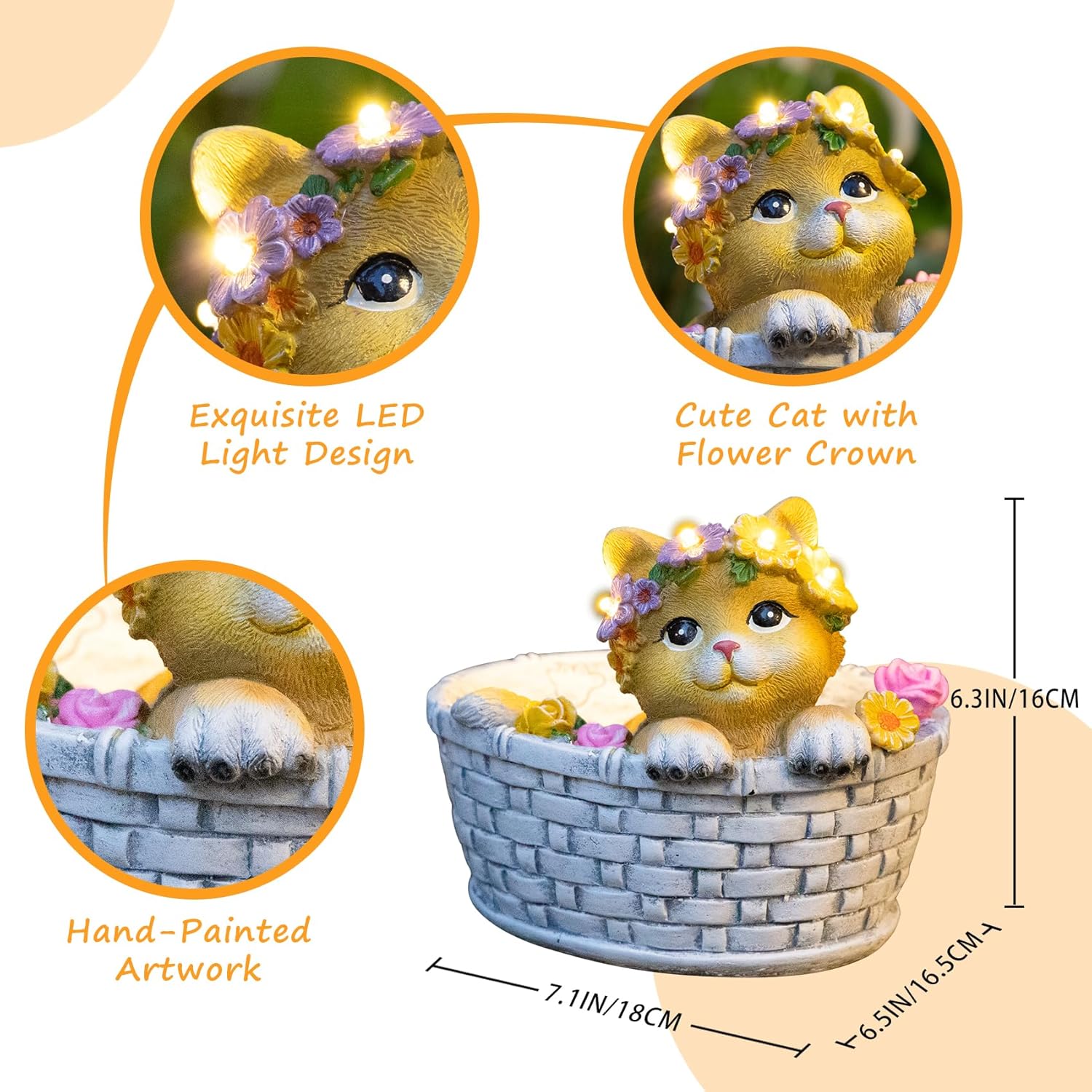 - {Unique Gifts Solar Cat Statue}: This solar yard statues design with a lovely kitten lie on the Basket Bed, with a flower crown on her head, the 8LED emit stunning warm white glow at night. When you see this cute sweety cat garden outside art, your body will feel relax and bring you a lot of fun every day.