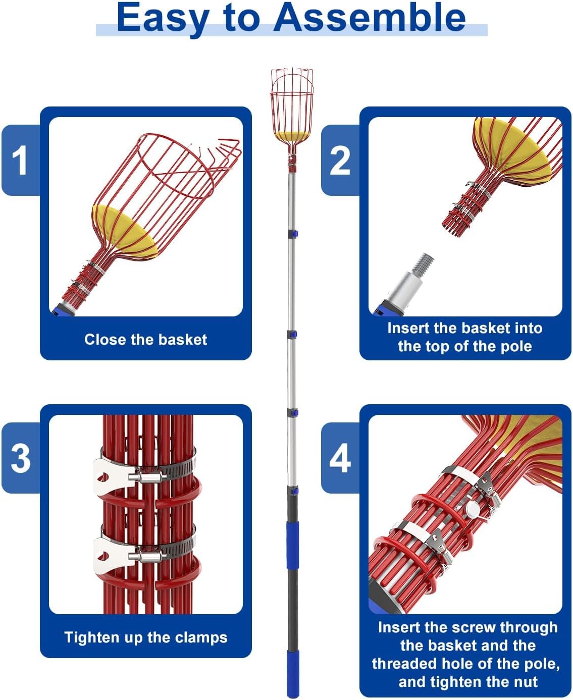 - Easy to Install - This fruit picker only requires a few simple installation steps. Firstly, fix the fruit basket to the pole with a metal clip, then thread the long screw through the hole on the pole and the fruit basket, and finally secure it with a nut. Without the need for additional tools, the fruit picking basket can be easily and firmly fixed to the extension rod.
