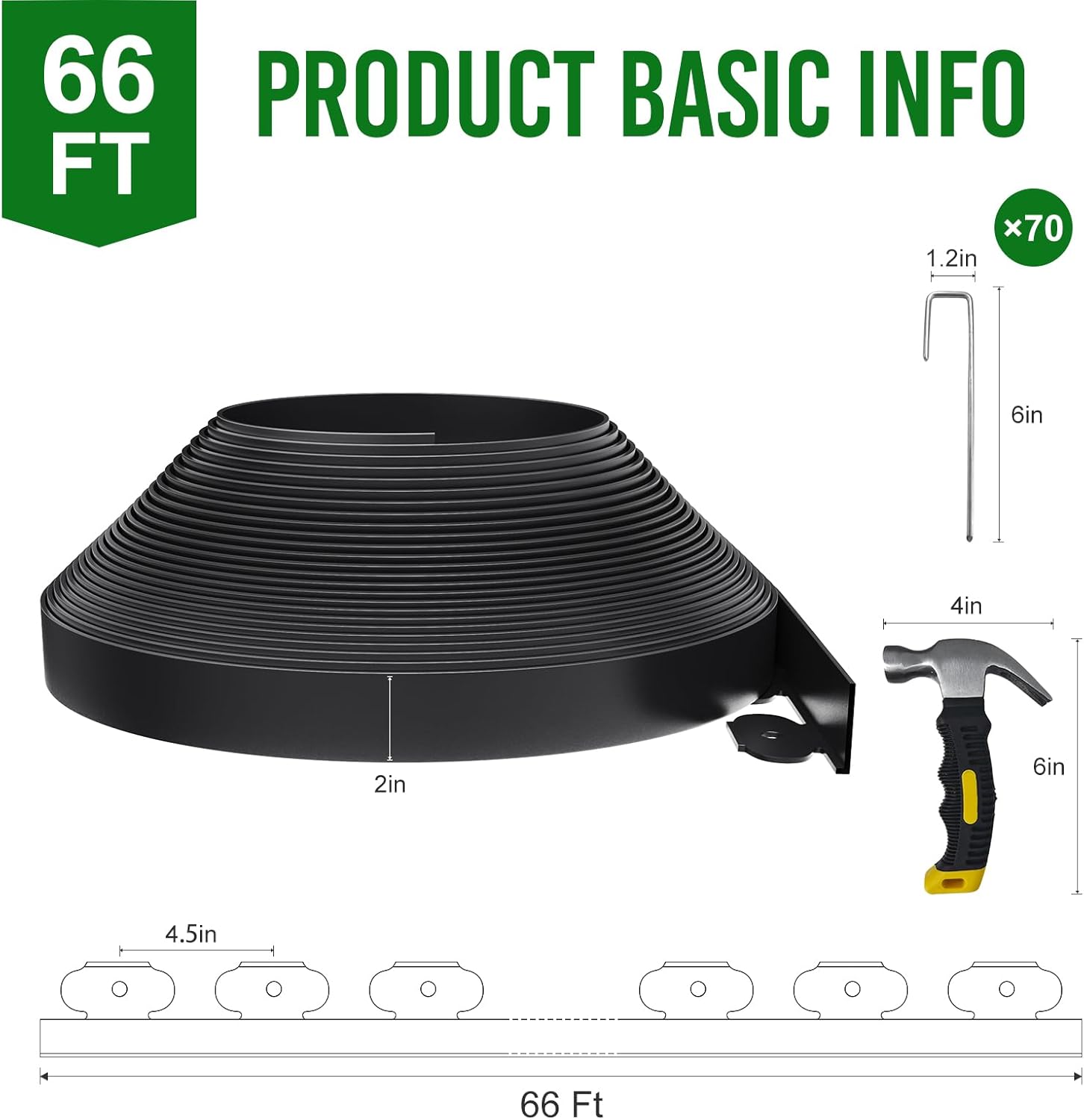 - What You Will Get: 1x Landscape edging border 66FT length 2'' tall, 70x metal ground stakes in 6'' and 1x 8oz hammer. No need to buy extra tools, just open the packaging and create an orderly landscape