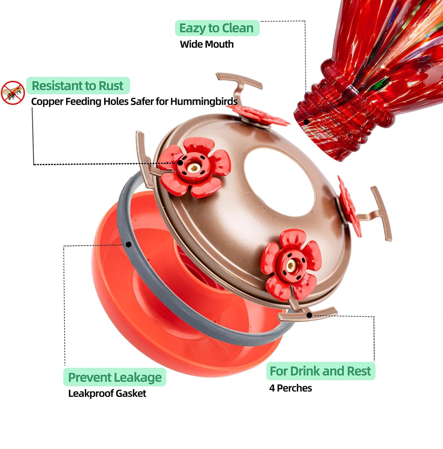 - 【Leakproof and SAFER Feeder Ports】The metal base is equipped with sealing ring and plastic basin for leakproof. UPGRADED feeder ports are made with premium copper materials, no sharp edges . Make sure the gasket is securely attached before you hanging the hummingbird feeders outside.