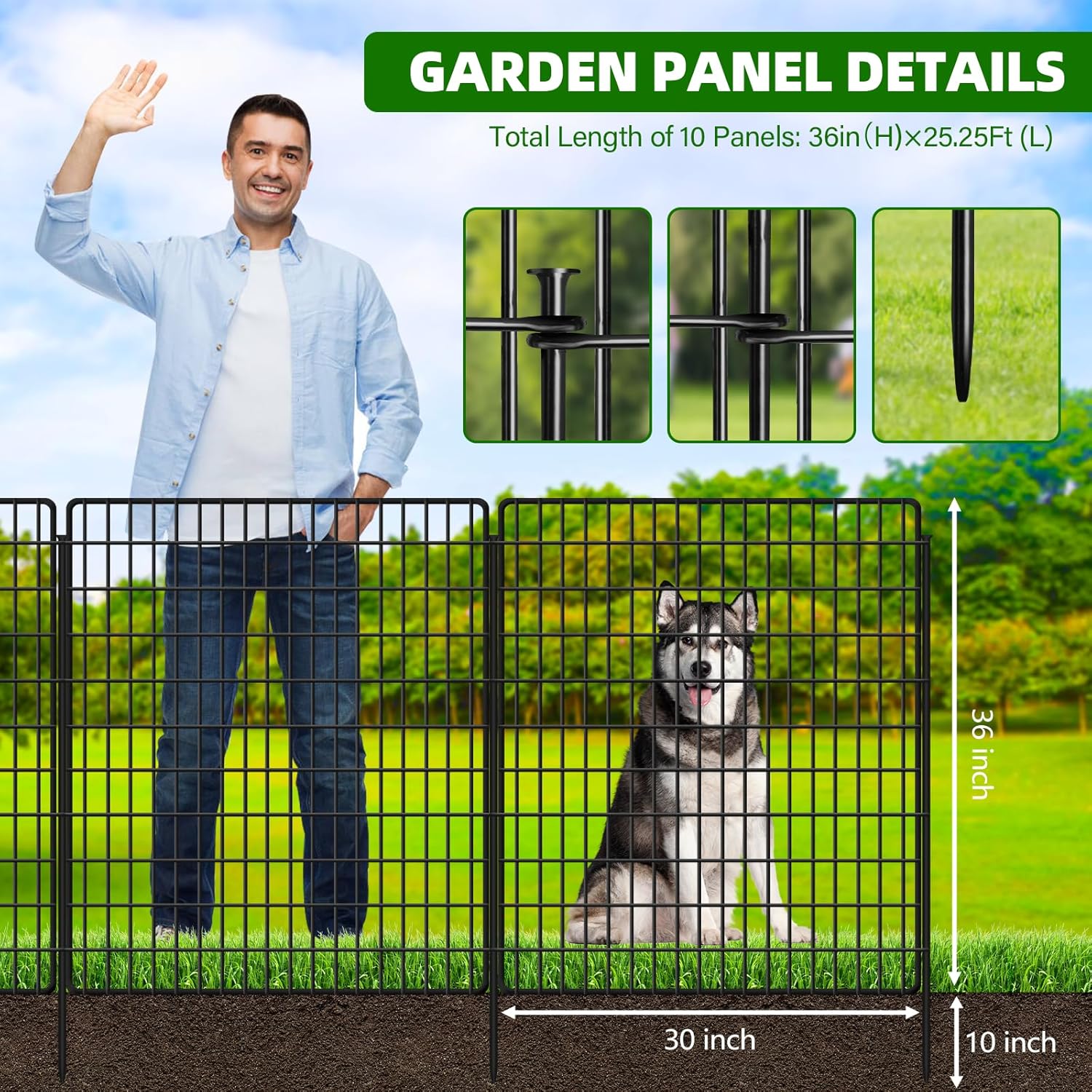 - Dog Fence for Yard --- Each panel of the dog fence measures 36" H x 30" W, can be connected and expanded into different shapes based on your specific needs. Upgraded to 36-inch heightening design to prevent large dogs from entering the garden.