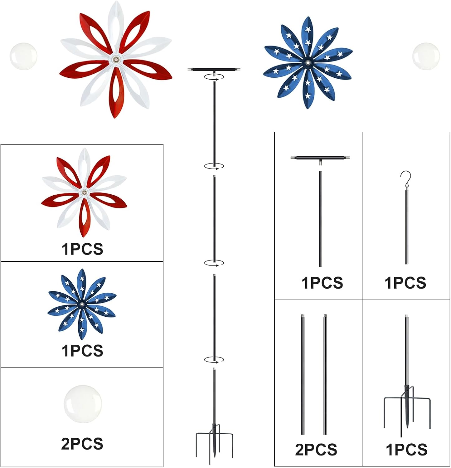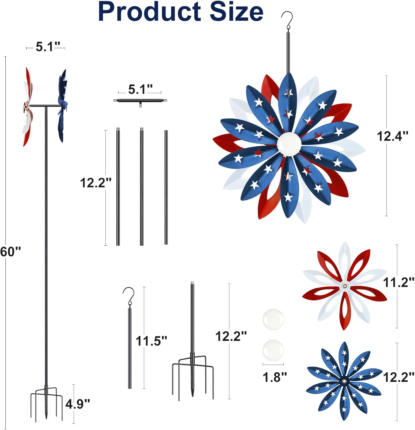 - Special Garden Wind Spinner: Outdoor large wind spinners have two layers blades and designed with USA flag classic colors, red, white and blue, and there are hollow patterns of stars on the blades,the brightly colored kinetic wind spinner will catch the eye of any passerby,Would look amazing in any flower garden or backyard .