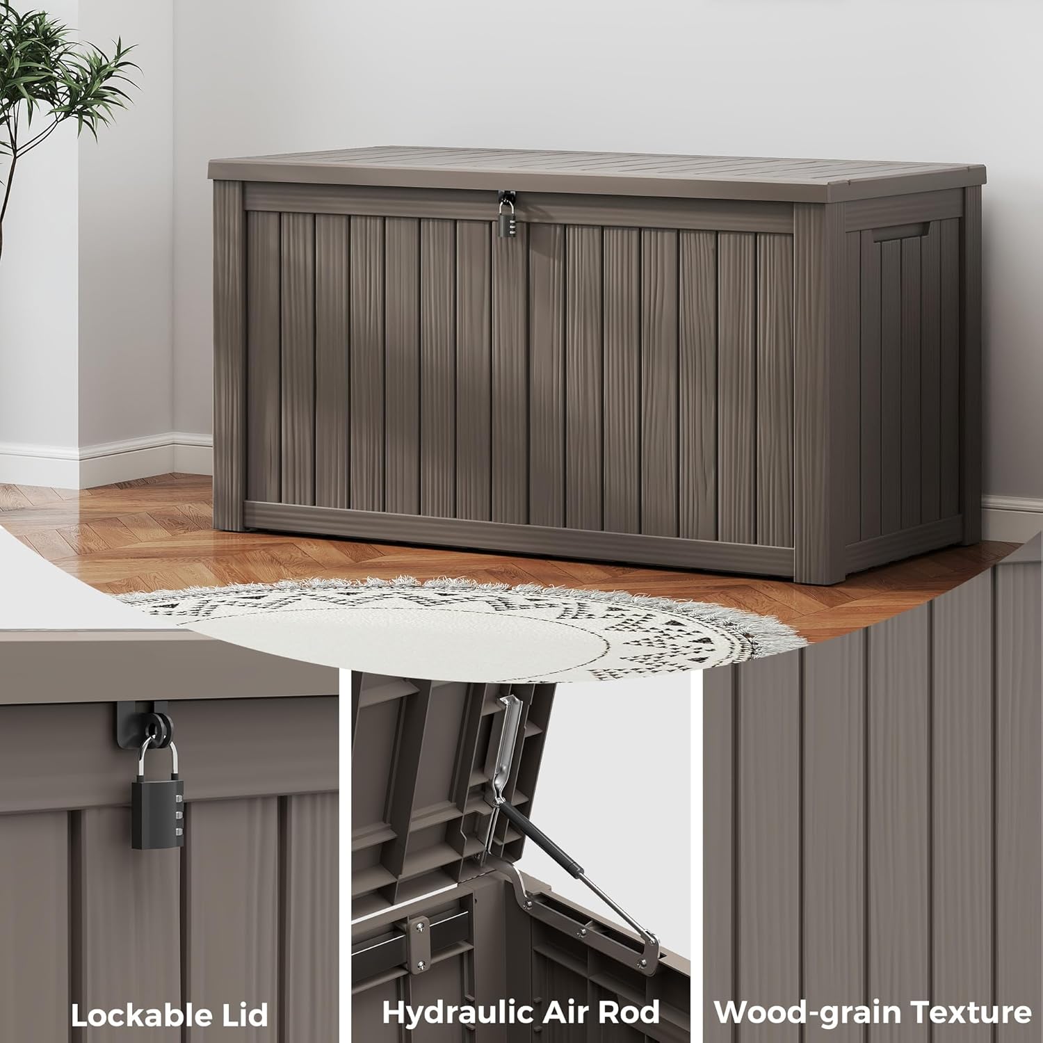 - ALL WEATHER RESISTANT - Weatherproof resin makes this outdoor storage box waterproof, rustproof, corrosion resistant and extremely low maintenance; its wood grain complements any décor; NOTE: The colour of the storage box may vary in different scenarios, with darker colours indoors and lighter colours outdoors; to avoid accidents, please remember to remove all stored items before moving the storage box!