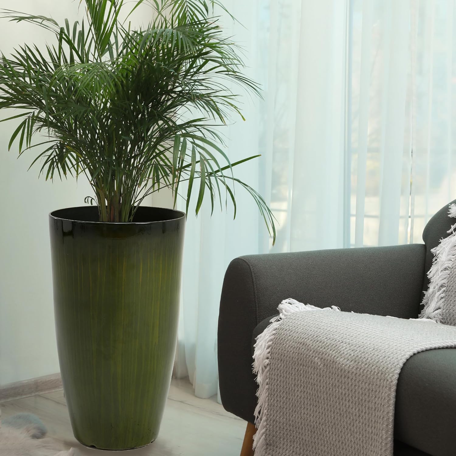 Worth Garden 23.5" H. Large Plastic Planters - Set of 2 Gradient Green Glossy Smooth Finish - Tall Plant Pots for Indoor & Outdoor Use - Decorative Lightweight Flower Pots for Front Porch, Patio, Deck