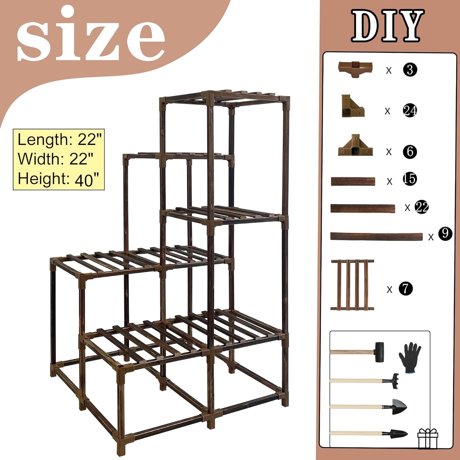 - Easy Assembly : Better to follow the installation video, which helps you to finish the plant rack quickly. It’s easy to modify the shape, or add more shelf space. The package comes with every parts you need, including the mallet. Please make sure to leave holes on the connectors facing up.