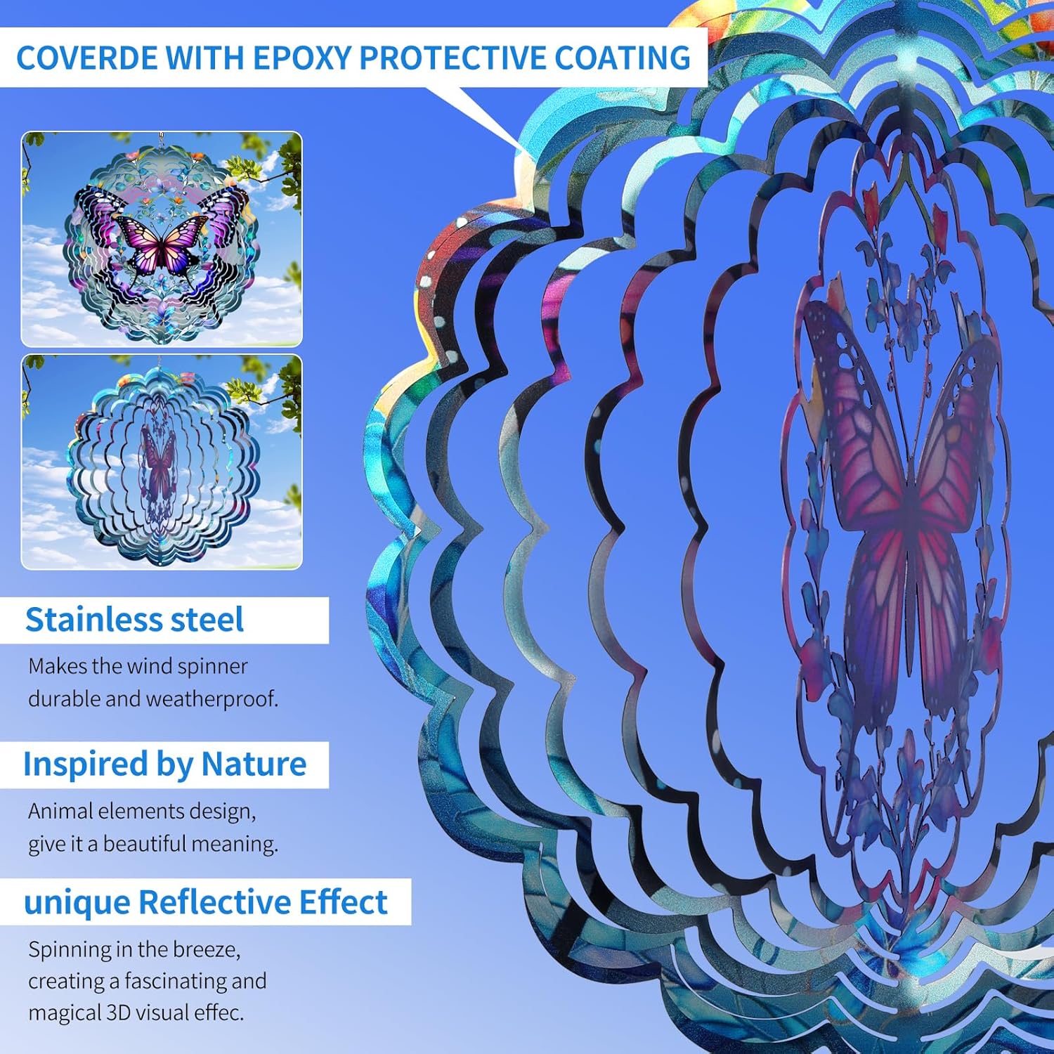 - 12inch 3D Butterfly Wind Spinner Outdoor Decor - Cawalap Butterfly Metal Wind Spinner is made from Sturdy stainless steel material by laser-cutting technology to form vivid shape, makes it flexible and strong, is individually hand painted by epoxy protective coating with colorful sparkle powder inside to highly resist weather and rust. a frosted paint finish, giving off a sparkling when it spin. The unique design combined meaningful animal pattern and a 3D streamer effect.