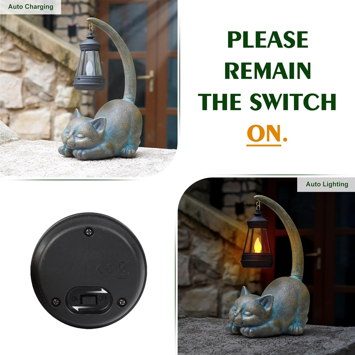 - Original Design:This bronze cat statue features delicate textures and a lantern dangling from its tail, emitting a flickering, flame-like light. Size: 3.94"W x 6.69"D x 10.03"H. Note: The tail comes disassembled and requires simple assembly