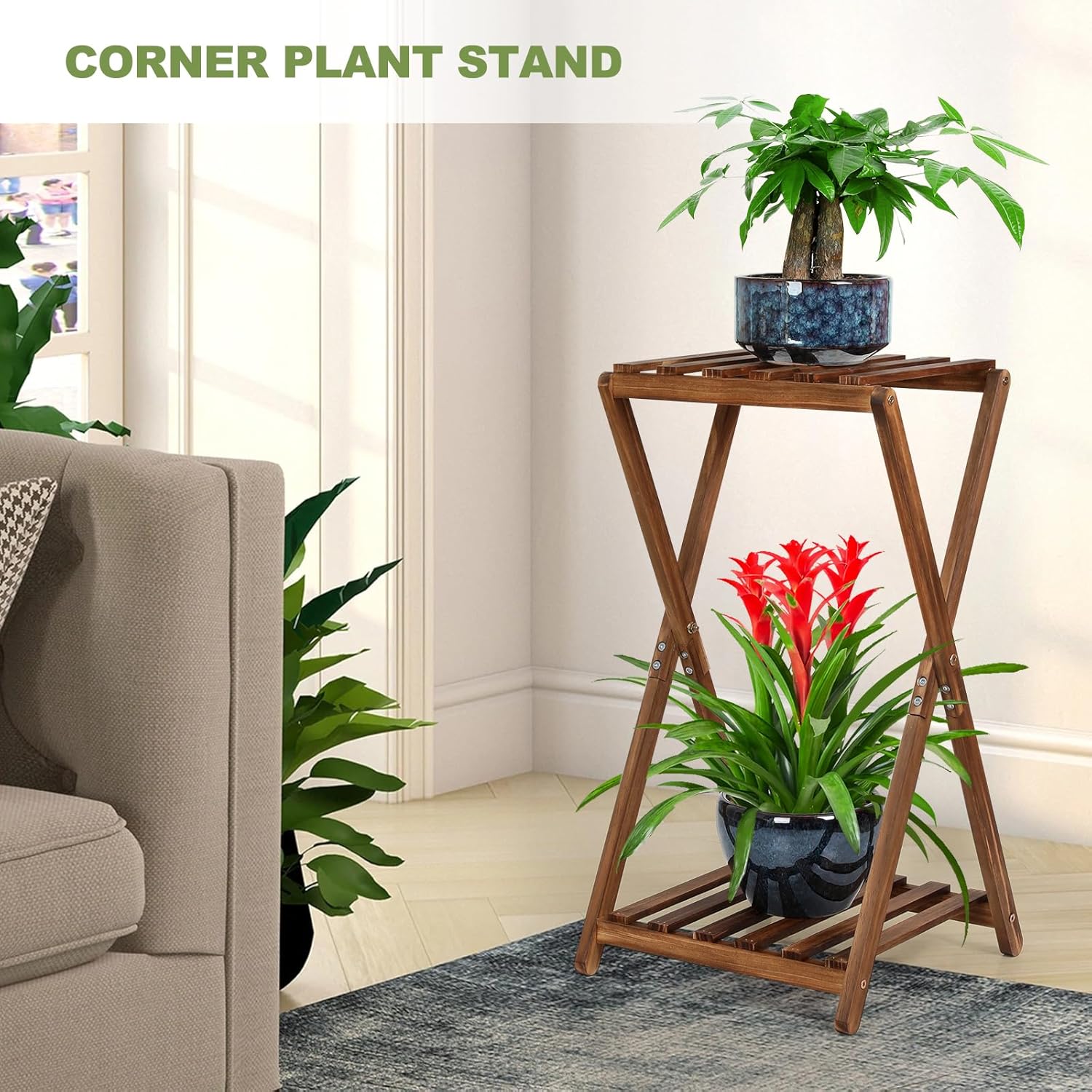 Plant Stand Indoor,Wooden 2 Tier Plant Stands,Corner Square Plant Shelf,Rustic Flower Stand Tall Plant Holder for Living Room Bedroom Balcony Office