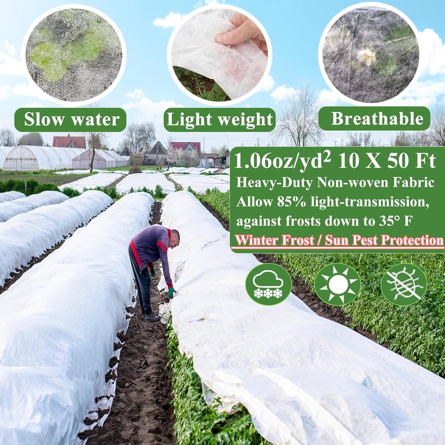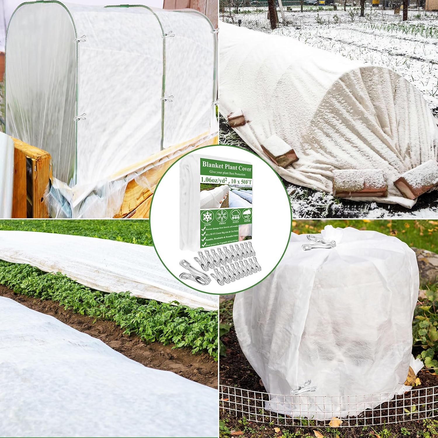 - 10FT X 50FT Frost Blankets for Outdoor Plants&Trees : Our frost plant cover 10 X 50FT large size, frost cloth plant freeze protection can cover large areas, you can cut frost cloth freely into different sizes to meet your need. Freeze cloth not only can against frost,snow,birds and insects but also great for extending the growing season. Perfect Floating row cover for plants all season.You can cover it over the plant such as shrub tomato, pepper, pumpkin and so on.